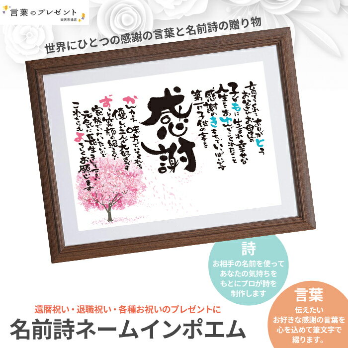 【注文の流れ】 1:注文が完了しましたらメールが届きますので、そちらに記載の方法にてアンケート項目のご返答をお願いします。 2:名前詩(ネームインポエム)を作成し、メールにてご案内します。修正点がありましたら、修正内容をお知らせください。 3:最終的に完成した名前詩(ネームインポエム)をフレームに入れた状態でお届けします。還暦祝い、誕生日プレゼント等、各種お祝いにご利用ください。 商品概要:-結婚式の両親のプレゼントに感謝のキモチを伝える『言葉のプレゼント』-言葉のプレゼント 楽天市場店では、似顔絵と筆文字で作る世界にひとつのオリジナルサンクスボード制作サービスのお店です。結婚式、二次会、披露宴、結婚パーティー、顔合わせ、結婚のご挨拶などで、「ありがとう」の気持ちを伝える、おしゃれで可愛いブライダルギフト、を取り扱っています。言葉 ギフト 贈呈品名前詩(ネームインポエム)は、プレゼント相手のお名前とお客様の伝えたい想いを元に制作する「言葉のプレゼント」です。 当店の名前詩は、書体・背景デザイン・フレームを選ぶことが出来ます。 書体(3種類) ほっこり かわいい 躍動 背景デザイン(11種類) 01 02 03 04 05 06 07 08 09 10 11 フレーム(4種類) 1.木製ブラウンフレーム 2.木製ナチュラルフレーム 3.アクリルフレーム 4.アルミシルバーフレーム 感謝の気持ちを伝えることは気恥ずかしい、 それにうまく言葉にすることができない、という 思いはどなたにもあるかと思います。 しかし、気持ちは言葉にして伝えないと伝わらないことも事実。 言葉のプレゼントの作詩家は、述べ1万件以上の名前詩を 制作しており、そのほぼ全てのお客様にご満足いただいています。 お客様の伝えたい気持ちを元に、様々な表現を用いて ストレートに伝わる名前詩(ネームインポエム)を作成するので 感動してもらえる特別なプレゼントになります。 安心の保障システム 期日も決まっている大切なプレゼントに失敗は許されません。言葉のプレゼントでは、安心してご注文いただけるように安心の保障システムをご用意しています。 ■作成した名前詩(ネームインポエム)をメールでご案内 名前詩(ネームインポエム)の内容が本当にお客様の気持ちを伝えているものなのか、ご心配があるかと思います。言葉のプレゼントでは、完成した名前詩(ネームインポエム)はメールでご案内します。商品がお手元に届く前に仕上がりの状態を確認することができるので、安心です。 ■何度でも修正可能 作られた名前詩(ネームインポエム)を見てご満足いただけなければ、修正可能です。何度でも無料で修正しますので、修正点はお気軽にお申し付けください。 ■それでも納得できなければ注文キャンセル可能 何度修正してもご満足いただけない場合は、注文キャンセル可能です。その場合、一切料金はかかりません。※商品の特性上、いったんご了承のお返事をいただいてからの修正や注文キャンセルは承れません。予めご了承ください。