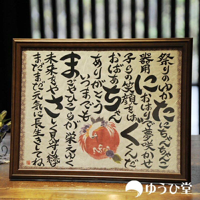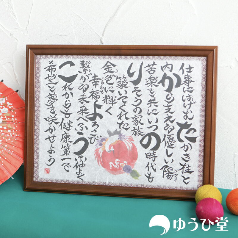 商品名 感謝の気持ち専用『幸せ寿額・M』ちぎり絵 額縁サイズ M(415ミリ×324ミリ) 額縁カラー ブラウン・ナチュラル 額縁材質 ガラス・木製 下布 全4種類 ちぎり絵(墨絵) 全29種類 納期 事前確認不要(発送後の確認でOK)の場合は納期の短縮が可能です。 平日(土、日、祝日以外)は正午までのご注文で当日出荷も可能です。 備考欄にてご希望のお届け日をお申し付けください。 ラッピング 包装(無料)熨斗紙(無料) 商品説明 人生や生き方について、 感謝の気持ちや労いの心を 表現した素敵な詩を、 お一人様の氏名または、 お二人様の連名で制作します。 お孫さんや奥様等のサブ名入れもOK(漢字限定) ※備考欄にてご要望下さい ※ちぎり絵・墨絵は印刷となります 『額装マットor友禅和紙』仕様はコチラ ゆうひ堂一番人気の作品はコチラ ■ 長寿のお祝い 一覧表 【還暦】 61歳 ( 満60歳 ) 60年で再び生まれた年の干支(えと)に還ることから「 還暦 」と呼ばれ 赤いちゃんちゃんこでお祝いをします。 【古希 ( 古稀 )】 70歳 杜甫の中の「人生七十古来稀なり」の句から七十歳のお祝いが「古希祝」と呼ばれ紫色のちゃんちゃんこでお祝いをします。 【喜寿】 77歳 「喜」の草書体が「七十七」と分解できることから数え年の七七歳のお祝い が「喜の字の祝い」「喜寿祝」と呼ばれお祝いの色は紫色です。 【傘寿】 80歳 「傘」の略体が「八十」と分解できることから数え年の八十歳のお祝い が「傘寿の祝い」「傘寿祝」と呼ばれ色は紫、黄色と諸説あります。 【米寿】 88歳 「米」のが「八十八」となることから数え年の八十八歳のお祝いが「米寿の祝い」「米寿祝」と呼ばれお祝いの色は金茶、黄色と諸説あります。 【卒寿】 90歳 「卒」の略体「卆」が「九十」と分解できることから数え年の九十歳のお祝いが「卒寿の祝い」「卒寿祝」と呼ばれお祝いの色は白色です。 【白寿】 99歳 「百」の字から「一」をとると「白」の字になるので九十九歳のお祝いが「 白寿の祝い」「白寿祝」と呼ばれお祝いの色は白色です。 【紀寿 ( 百寿 )】 100歳 百年が一世紀ということから紀寿祝い、また百歳であることから百寿祝いと呼ばれお祝いの色は白色と桃色です。 ■ 結婚記念日のお祝い 一覧表 銀婚式 結婚して25年、結婚二十五周年を祝って行う式 真珠婚式 結婚して30年、結婚三十周年を祝って行う式 珊瑚婚式 結婚して35年、結婚三十五周年を祝って行う式 ルビー婚式 結婚して40年、結婚四十周年を祝って行う式 サファイア婚式 結婚して45年、結婚四十五周年を祝って行う式 金婚式 結婚して50年、結婚五十周年を祝って行う式 エメラルド婚式 結婚して55年、結婚五十五周年を祝って行う式 ダイヤモンド婚式 結婚して60年、結婚六十周年を祝って行う式 大切な方のお名前を使用してつくる折句、名前詩(ネームポエム)は結婚祝いや結婚式での両親贈呈、婚礼引き出物、ウェディング・ウェルカムボードとしてのご利用はもちろん、還暦や古希などの長寿お祝い、金婚式などの結婚記念日のお祝いとしてもご利用いただけます。 ※【名前詩】は、私たち 株式会社ゆうひ堂 の登録商標です。手書き手ちぎり和紙の名前ちりばめ詩