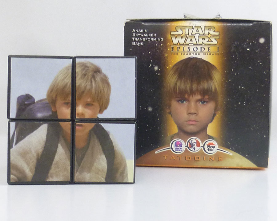 タコベル・ケンタッキー・ピザハットで貰えたノベルティです。 中のおもちゃがなかなかのクオリティでイイ感じです!!! キューブ面をひっくり返すとアナキン⇔ダース・ベイダーの2種類のデザインが楽しめる♪パッと見分からないですが、実は貯金箱にもなってるギミックが面白い!! 1999年 アプローズ社 サイズ:約高さ7.5×横7.5×厚み7.5センチ ※撮影のために開封しましたが、未開封の商品をお送りします。中身の部分にスレ等がある場合がございます。外箱に破れ・スレ等の傷みがございます。ご了承くださいませ。 ※本商品は系列店で同時販売をしている為、ご注文頂くタイミングによりお買い求め頂けない場合がございます。 予めご了承くださいませ。