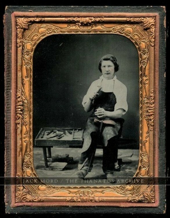 1800年代のアンティークアンブロタイプによる、道具を持った靴職人の珍しい職業写真
