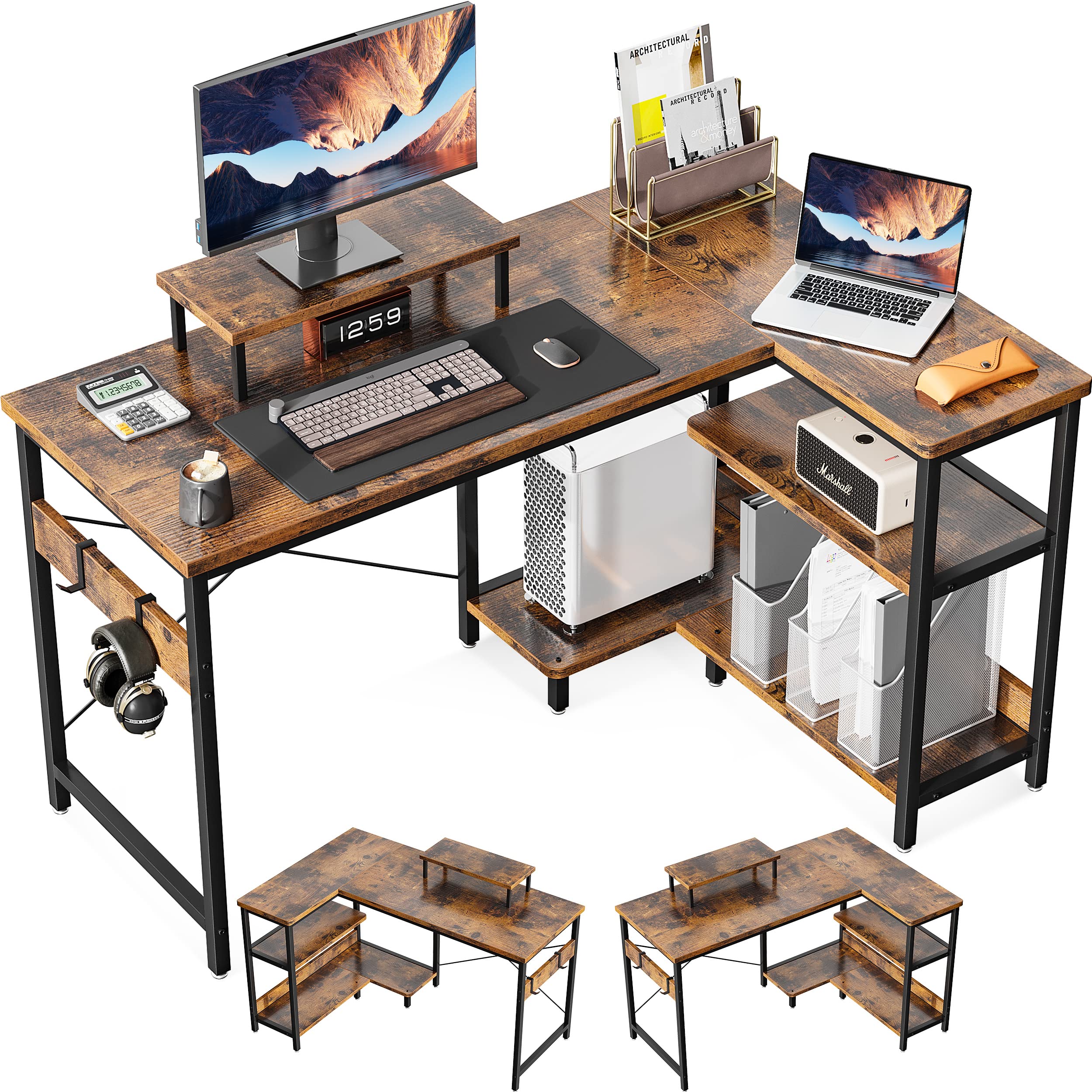 YeTom l字デスク ゲーミングデスク デスク 幅120cm pcデスク コーナーデスク 棚板高さ調節可能 収納袋付き L字型 PC 勉強机 作業 在宅勤務 リモートワーク ゲーム 書斎 収納ラック付き ダークブラウン