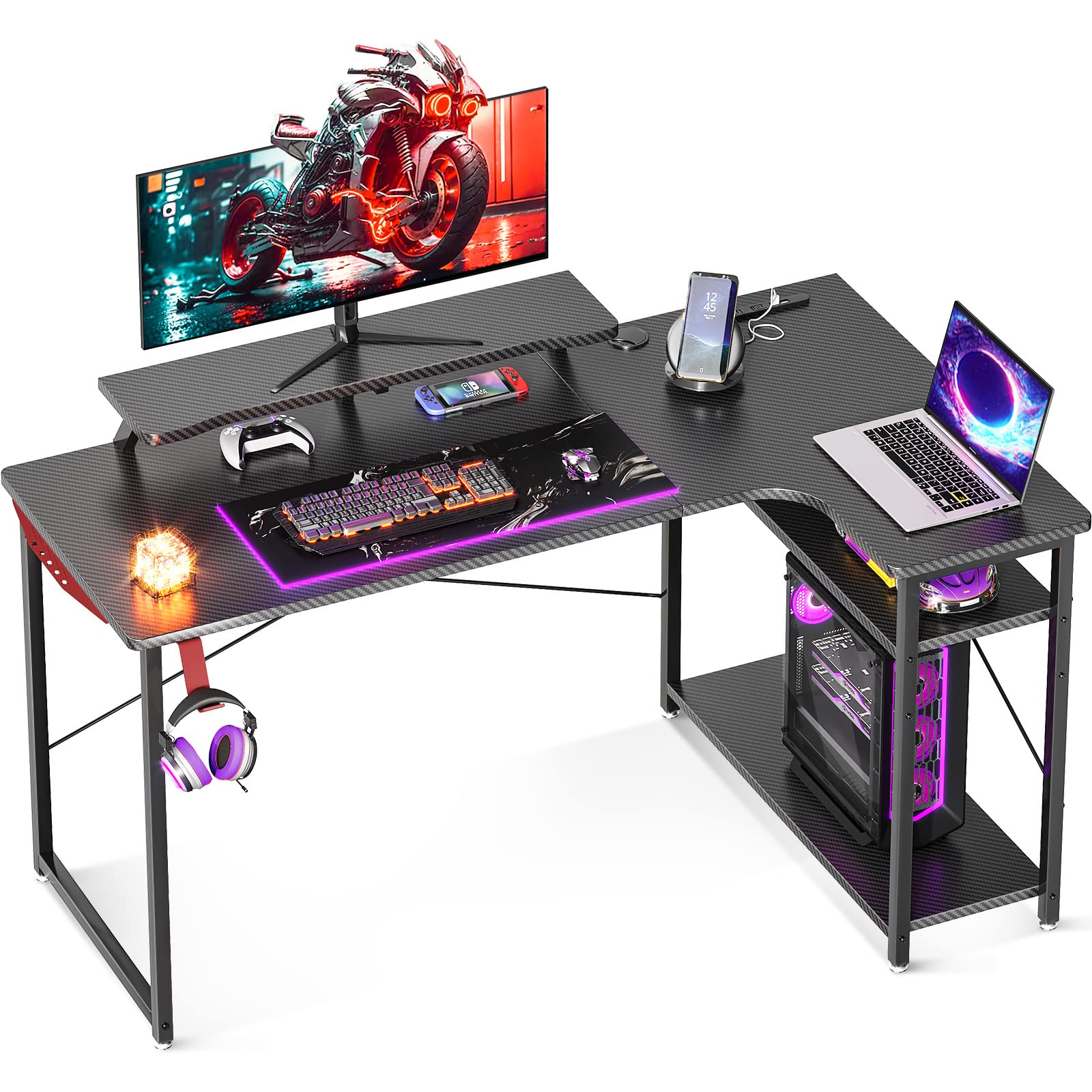 ODK ゲーミングデスク パソコンデスク 幅130 l字デスク コンセント付き pcデスク デスク 机 ラック付き コーナーデスク 収納 オフィスデスク 組立簡単 右棚 カーボン調ブラック