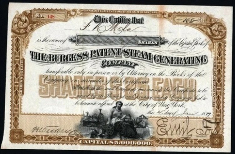 1889年 バージェス・ペアレント・スチーム・ジェネレーティング社 未消印 希少株券