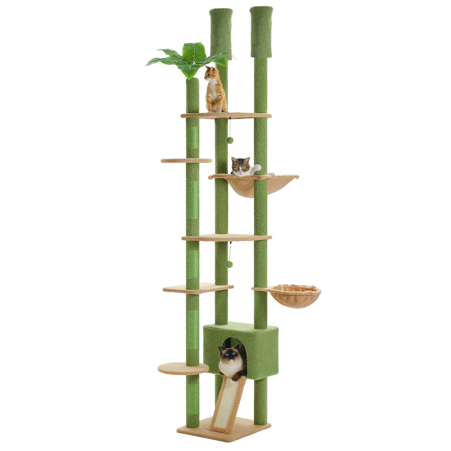 |  PETEPELA(ぺテぺラ) キャットタワー 突っ張り スリム 多頭飼い 猫タワー ツイン突っ張り コンパクト 省スペース 爪とぎ ハンモック2個 可愛い おしゃれ 運動不足解消 登りやすい - グリーン 高さ調整幅190~210cmと235~255cm