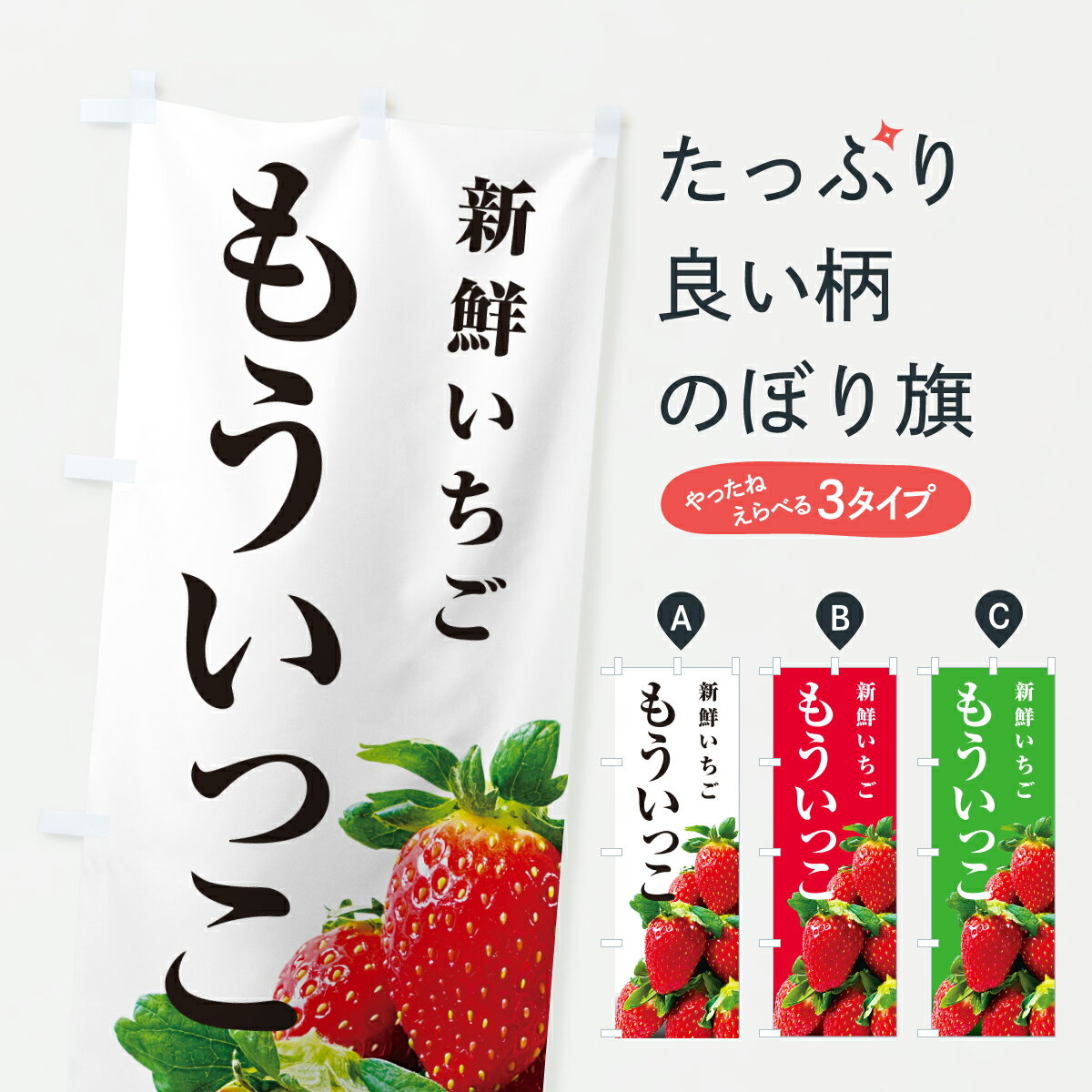 グッズプロののぼり旗は「節約じょうずのぼり」から「セレブのぼり」まで細かく調整できちゃいます。のぼり旗にひと味加えて特別仕様に一部を変えたい店名、社名を入れたいもっと大きくしたい丈夫にしたい長持ちさせたい防炎加工両面別柄にしたい飾り方も選べます壁に吊るしたい全面柄で目立ちたい紐で吊りたいピンと張りたいチチ色を変えたいちょっとおしゃれに看板のようにしたいいちご・苺のぼり旗、他にもあります。【ポスト便 送料360】 のぼり旗 もういっこ・新鮮いちごのぼり 6016 いちご・苺 グッズプロ内容・記載の文字もういっこ・新鮮いちご印刷自社生産 フルカラーダイレクト印刷またはシルク印刷デザイン【A】【B】【C】からお選びください。※モニターの発色によって実際のものと色が異なる場合があります。名入れ、デザイン変更(セミオーダー)などのデザイン変更が気楽にできます。以下から別途お求めください。サイズサイズの詳細については上の説明画像を御覧ください。ジャンボにしたいのぼり重量約80g素材のぼり生地:ポンジ(テトロンポンジ)一般的なのぼり旗の生地通常の薄いのぼり生地より裏抜けが減りますがとてもファンが多い良い生地です。おすすめA1ポスター:光沢紙(コート紙)チチチチとはのぼり旗にポールを通す輪っかのことです。のぼり旗が裏返ってしまうことが多い場合は右チチを試してみてください。季節により風向きが変わる場合もあります。チチの色変え※吊り下げ旗をご希望の場合はチチ無しを選択してください対応のぼりポール一般的なポールで使用できます。ポールサイズ例:最大全長3m、直径2.2cmまたは2.5cm※ポールは別売りです ポール3mのぼり包装1枚ずつ個別包装 PE袋(ポリエチレン)包装時サイズ:約20x25cm横幕に変更横幕の画像確認をご希望の場合は、決済時の備考欄に デザイン確認希望 とお書き下さい。※横幕をご希望でチチの選択がない場合は上のみのチチとなります。ご注意下さい。のぼり補強縫製見た目の美しい四辺ヒートカット仕様。ハトメ加工をご希望の場合はこちらから別途必要枚数分お求め下さい。三辺補強縫製 四辺補強縫製 棒袋縫い加工のぼり防炎加工特殊な加工のため制作にプラス2日ほどいただきます。防炎にしたい・商標権により保護されている単語ののぼり旗は、使用者が該当の商標の使用を認められている場合に限り設置できます。・設置により誤解が生じる可能性のある場合は使用できません。(使用不可な例 : AEDがないのにAEDのぼりを設置)・裏からもくっきり見せるため、風にはためくために開発された、とても薄い生地で出来ています。・屋外の使用は色あせや裁断面のほつれなどの寿命は3ヶ月・・6ヶ月です。※使用状況により異なり、屋内なら何年も持ったりします。・雨風が強い日に表に出すと寿命が縮まります。・濡れても大丈夫ですが、中途半端に濡れた状態でしまうと濡れた場所と乾いている場所に色ムラが出来る場合があります。・濡れた状態で壁などに長時間触れていると色移りをすることがあります。・通行人の目がなれる頃(3ヶ月程度)で違う色やデザインに替えるなどのローテーションをすると効果的です。・特別な事情がない限り夜間は店内にしまうなどの対応が望ましいです。・洗濯やアイロン可能ですが、扱い方により寿命に影響が出る場合があります。※オススメはしません自己責任でお願いいたします。色落ち、色移りにご注意ください。商品コード : 6016問い合わせ時にグッズプロ楽天市場店であることと、商品コードをお伝え頂きますとスムーズです。改造・加工など、決済備考欄で商品を指定する場合は上の商品コードをお書きください。ABC【ポスト便 送料360】 のぼり旗 もういっこ・新鮮いちごのぼり 6016 いちご・苺 グッズプロ 安心ののぼり旗ブランド 「グッズプロ」が制作する、おしゃれですばらしい発色ののぼり旗。デザインを3色展開することで、カラフルに揃えたり、2色を交互にポンポンと並べて楽しさを演出できます。文字を変えたり、名入れをしたりすることで、既製品とは一味違う特別なのぼり旗にできます。 裏面の発色にもこだわった美しいのぼり旗です。のぼり旗にとって裏抜け(裏側に印刷内容が透ける)はとても重要なポイント。通常のぼり旗は表面のみの印刷のため、風で向きが変わったときや、お客様との位置関係によっては裏面になってしまう場合があります。そこで、当店ののぼり旗は表裏の見え方に差が出ないように裏抜けにこだわりました。裏抜けの美しいのグッズプロののぼり旗は裏面になってもデザインが透けて文字や写真がバッチリ見えます。裏抜けが悪いと裏面が白っぽく、色あせて見えてしまいズボラな印象に。また視認性が悪く文字が読み取りにくいなどマイナスイメージに繋がります。いろんなところで使ってほしいから、追加料金は必要ありません。裏抜けの美しいグッズプロののぼり旗でも、風でいつも裏返しでは台無しです。チチの位置