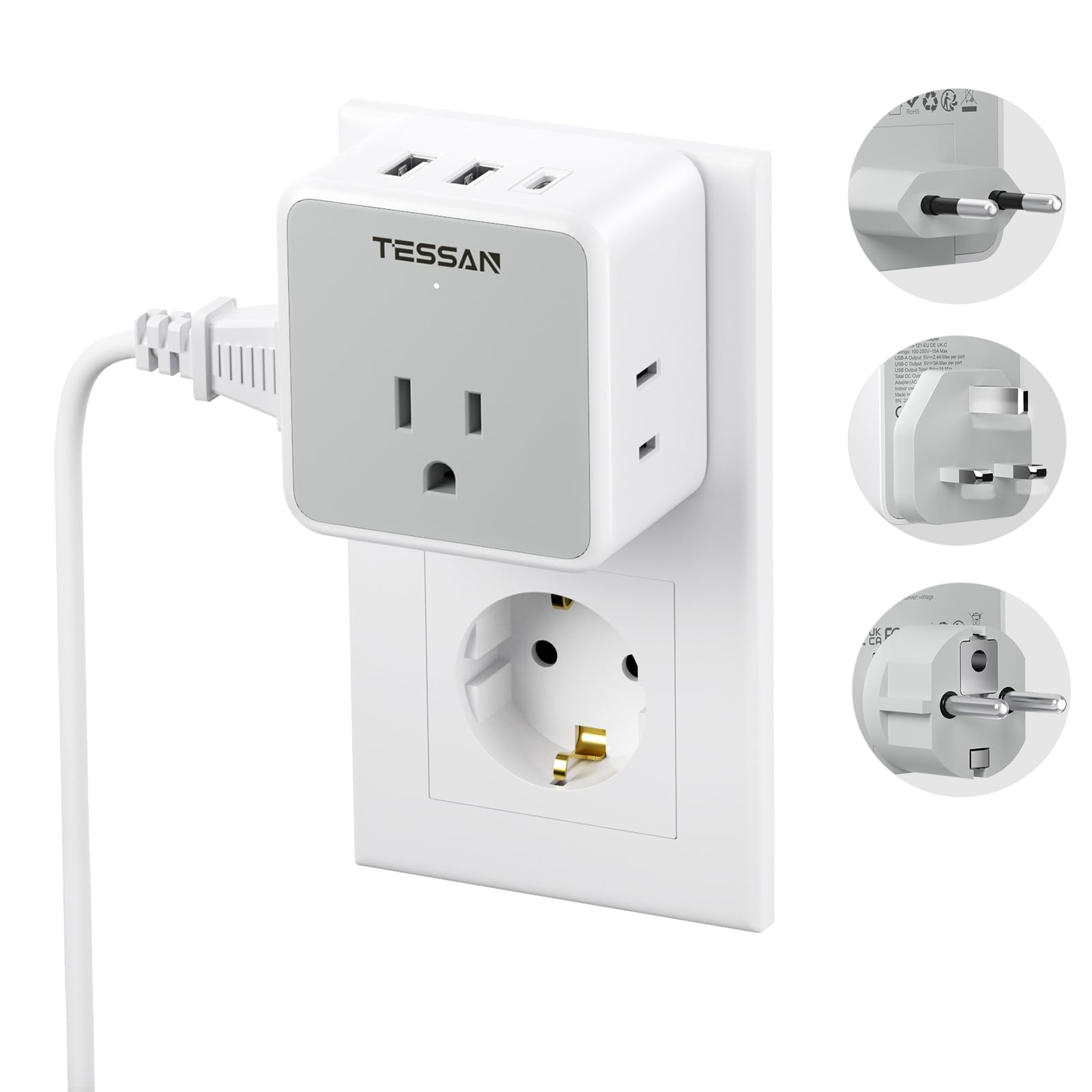 変換プラグ 海外コンセント C/BF/SEタイプ TESSAN海外旅行用アダプター 取り外し可能 3個AC口 2つtype-Aと1つUSB-Cポート付き 韓国/ドイツ/イタリア/シンガポール/イギリス/香港/東南アジア/ヨーロッパなどの国に対応