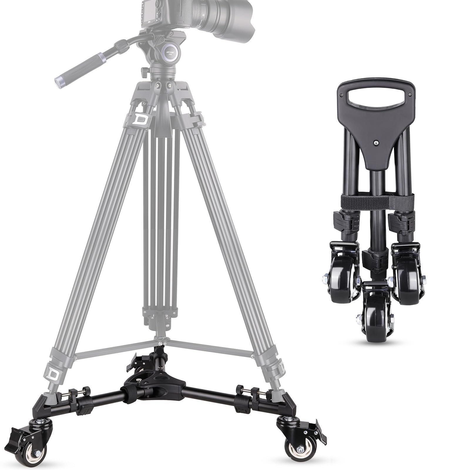 ・【軽量で安定した三脚ドリー】三脚ドリーは軽量なアルミ素材を採用し、三脚と組み合わせて、動きやすくて持ち運びも便利です。カメラやビデオ三脚、ライトスタンド、背景スタンドと一緒に使用できる優れた三脚ドリーです。最大耐荷重:15キロ。・【簡単に持ち運び】大きなハンドルでしっかり握り、折り畳み式でコンパクトに収納でき、持ち運び時も大変便利です。三脚ドリーバッグを付きます。・【ビデオに最適】ARTCISE 三脚ドリーは、プロのカメラやビデオ三脚、ライトスタンド、背景スタンドと一緒に使用できる優れたドリーです。移動撮影だけでなく、照明スタンドを固定して光の位置を微調整したり、カメラをセットして画角を確認しながら移動する用途でも大活躍します。・【簡単に操作する】三脚を乗せて、ネジで固定するだけで簡単に取り付けできます。ファストアクションフットブレーキがあります。ドリーを折りたたんだり開いたりするためにプルピンをロックします。・【広い互換性】三脚ドリーは標準的な三脚やライトスタンドに適します。迅速かつ簡単にお使いの三脚を移動可能なものに変換し、三脚を移動しながら、安全に静かにショートを取れます。結婚式や運動会などでの撮影に最適です。・【パッケージリストと2年返品保証】三脚ドリー*1、三脚ドリーバッグ*1。ご購入日から、2年の返品保証サービスを提供します。品質保証期間内で、何か問題がございましたら、返金或いは再送させていただきます。弊社にご連絡いただければ日本語スタッフが迅速に対応いたします。ご遠慮なくお問い合わせください。【軽量で安定した三脚ドリー】三脚ドリーは軽量なアルミ素材を採用し、三脚と組み合わせて、動きやすくて持ち運びも便利です。カメラやビデオ三脚、ライトスタンド、背景スタンドと一緒に使用できる優れた三脚ドリーです。最大耐荷重:15キロ。