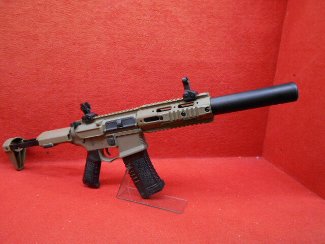 ARESより、M4をベースに全長を短く切りつめ、サブマシンガンのようにした オリジナルモデル。 回路に新機能の EFCS (Electric Firing Control System) という電子制御システムを搭載しキレのいい射撃が可能となっています。 また、このシステムにより回路のショートや電流/電圧異常、 モーターロックといったメカボックス内の機械的なトラブルのリスクを低減がされています。 さらに、別売りの【EFCSコントローラー(品番 AR-OT-002)】を使用すれば、 バースト射撃への変更等が可能となります。 フレームをナイロンファイバー製にする事で非常に軽量、 金額的にも、取り回し的にもゲームユースに最適です。 本モデルはストックを廃することでピストルの様な外見を持つ 超コンパクトモデルとなっています。 バレルはフロントから露出していないタイプですが バレル自体に14mm正ネジのネジ切りがあるため、 別途、対応するハイダーやサイレンサーを取り付ける事ができます。 (サイレンサーを取り付ける場合、直径35mm以下のものが使用可能。) トップレールの真下がバッテリー収納口となっており、 M4ストックパイプ収納に収納出来るサイズのリポバッテリーがサイズとして最適です。 バッテリーコネクタ:ミニ マガジン装弾数:300発 全長: 約 325mm 重量: 約 1555g トリガーは掲載画像のノーマルトリガーの他、入荷ロットによりストレートトリガーの場合もございます。 また、それらはお選び頂けません。予めご了承下さい。