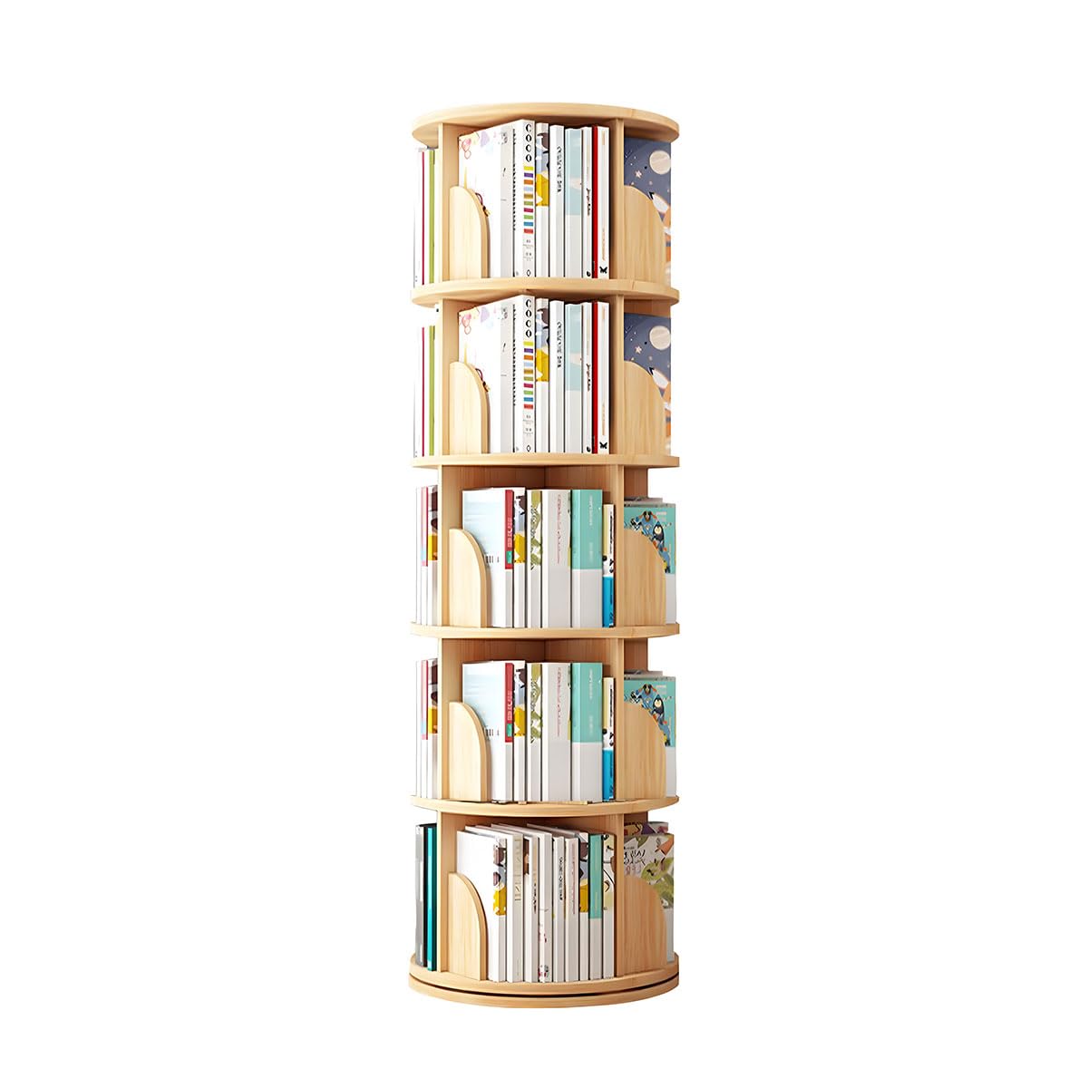 ・【360度回転式本棚】台座はベアリング入りで回転がとってもスムーズ。くるくる360度回せば、欲しいアイテムがすぐ目の前に現れ、探し物も楽々です。1段高さ30cm、A4サイズの収納に最適な回転式ラック。お部屋のコーナーなど狭い場所にも気軽に設置できます。・【100%の無垢材】天然の無垢材が使われており、木の風合いがやさしいです。滑らかな棚は耐磨、水や汚れに強い、防サビ、布で拭くだけで、きれいになっております,人間工学に基づいた円形設計で、ぶつかっても怪我を防げて柔らかい印象を与え、より安全で快適に使用できます。・【省スペース】サイズ:直径40cm×高さ160cm 棚板の厚みは1.2cmあり。4ヶ所の収納スペースは、すべてタイトル面を外側に向けに配置できます。大量収納なのに、探しやすく、取り出ししやすい構造です。・【多目的に使える回転ランク】 本棚や飾り棚、小物の整理棚など、様々な使い方ができるシンプルな回転ラック。数多くの類似品が市場に出回る中、使い勝手の良さと見た目にこだわった高品質で、ご家庭や職場など、あらゆるシーンで末永く長くご愛用いただける定番収納アイテムです。・【安心な1年保証】ご購入頂いた回転式本棚は1年間メーカー保障が付いております、商品の品質には万全を期しておりますが、万が一商品に不具合等発生したら、いつでもお気軽に出品者にお問い合わせください、迅速に無料交換や返金対応させていただきます。ご安心ください。