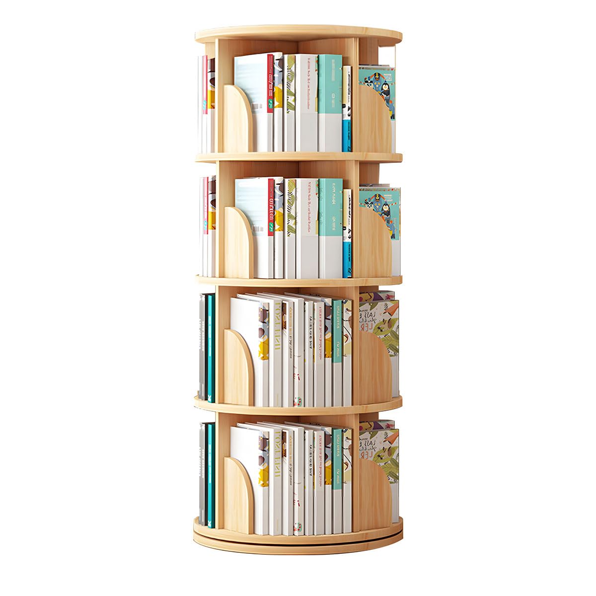 ・【360度回転式本棚】台座はベアリング入りで回転がとってもスムーズ。くるくる360度回せば、欲しいアイテムがすぐ目の前に現れ、探し物も楽々です。1段高さ30cm、A4サイズの収納に最適な回転式ラック。お部屋のコーナーなど狭い場所にも気軽に設置できます。・【100%の無垢材】天然の無垢材が使われており、木の風合いがやさしいです。滑らかな棚は耐磨、水や汚れに強い、防サビ、布で拭くだけで、きれいになっております,人間工学に基づいた円形設計で、ぶつかっても怪我を防げて柔らかい印象を与え、より安全で快適に使用できます。・【省スペース】サイズ:直径40cm×高さ128cm 棚板の厚みは1.2cmあり。4ヶ所の収納スペースは、すべてタイトル面を外側に向けに配置できます。大量収納なのに、探しやすく、取り出ししやすい構造です。・【多目的に使える回転ランク】 本棚や飾り棚、小物の整理棚など、様々な使い方ができるシンプルな回転ラック。数多くの類似品が市場に出回る中、使い勝手の良さと見た目にこだわった高品質で、ご家庭や職場など、あらゆるシーンで末永く長くご愛用いただける定番収納アイテムです。・【安心な1年保証】ご購入頂いた回転式本棚は1年間メーカー保障が付いております、商品の品質には万全を期しておりますが、万が一商品に不具合等発生したら、いつでもお気軽に出品者にお問い合わせください、迅速に無料交換や返金対応させていただきます。ご安心ください。
