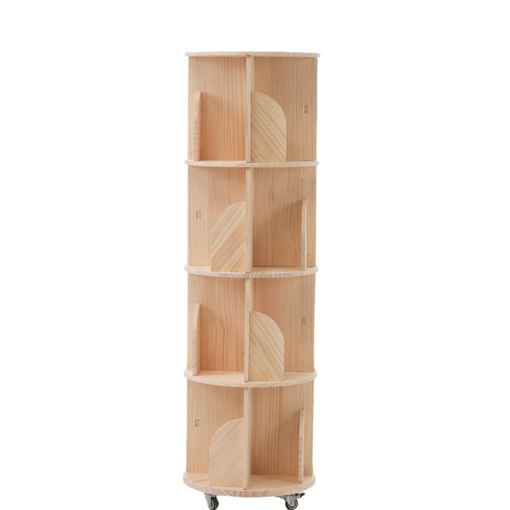 OSJ【4段-キャスタタイプ】回転式本棚 無垢材 キャスター 付き飾り棚 絵本棚 360°回転本棚 コミック収納棚 本棚 大容量 回転ラック 組立簡単 省スペース 収納ラック 4段 漫画収納 雑誌 教科書 CDラック DVDラック フィギュアラック 組立簡