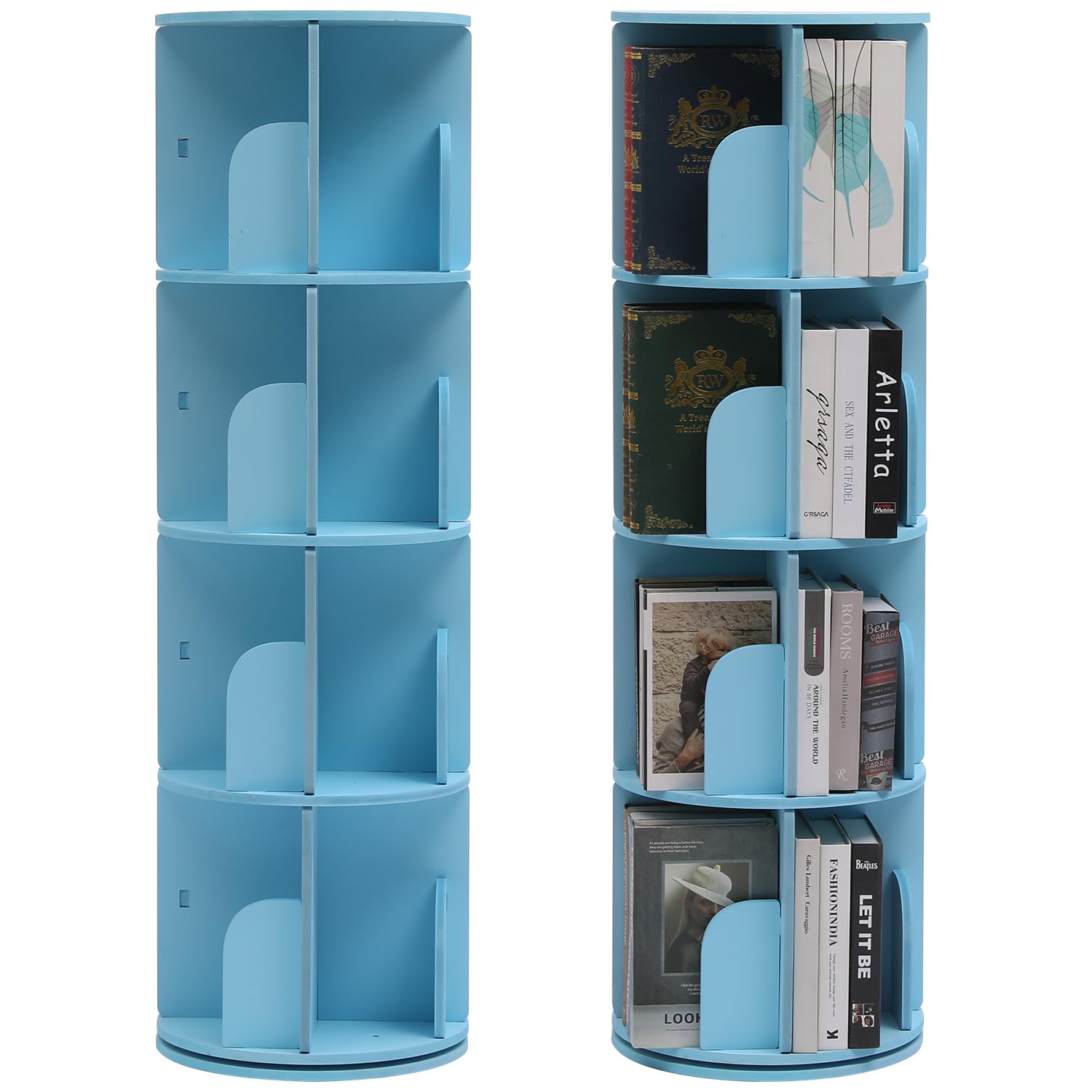 本棚 回転式本棚 大容量 絵本棚 スリム コミックラック 漫画 収納 組立簡単 絵本棚 回転ラック ブックシェルフ 収納棚 CD/DVDラック (ブルー, 4 段)