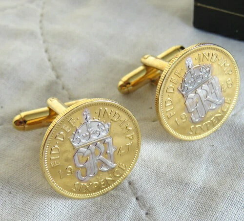 ジョージ6世 1947/8年 金メッキ 6ペンス カフスボタン セット - 箱入り