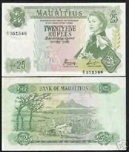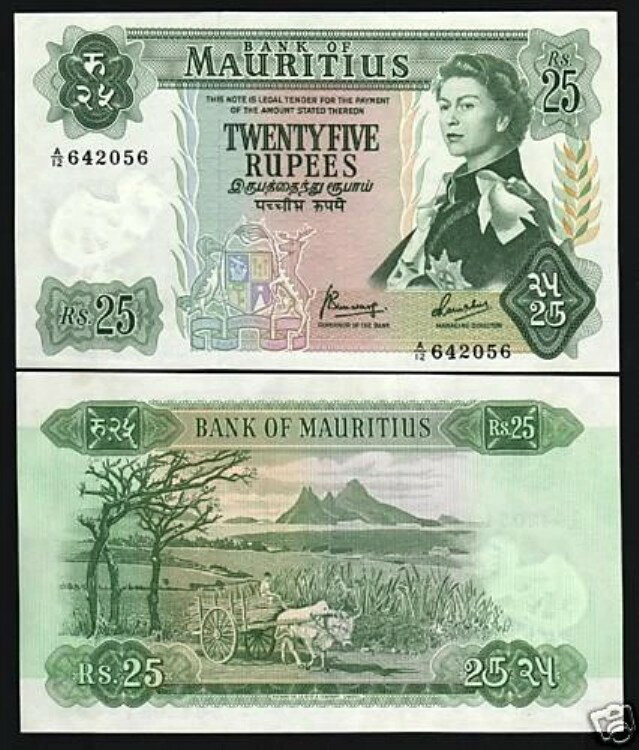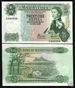 モーリシャス 25 ルピー P-32 B 1967 クイーン オックス サトウキビ UNC 希少紙幣 紙幣