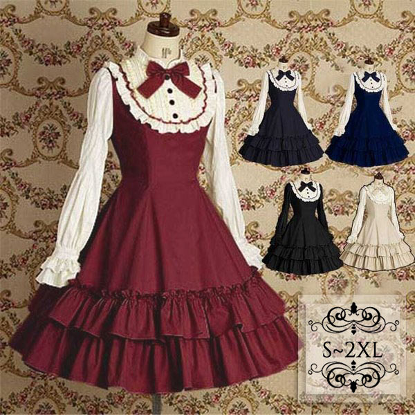 ワンピース レディース ロリータ ゴスロリ ガーリー Aライン 長袖 コスチューム 衣装 かわいい ローマンカラー フリル リボン 仮装 パーティー メルヘン 貴族 レディース ゴシック クラシカル コスプレ クラロリ 舞踏会 ハロウィン 紺色 黒 赤 ベージュ da050c0c0x1