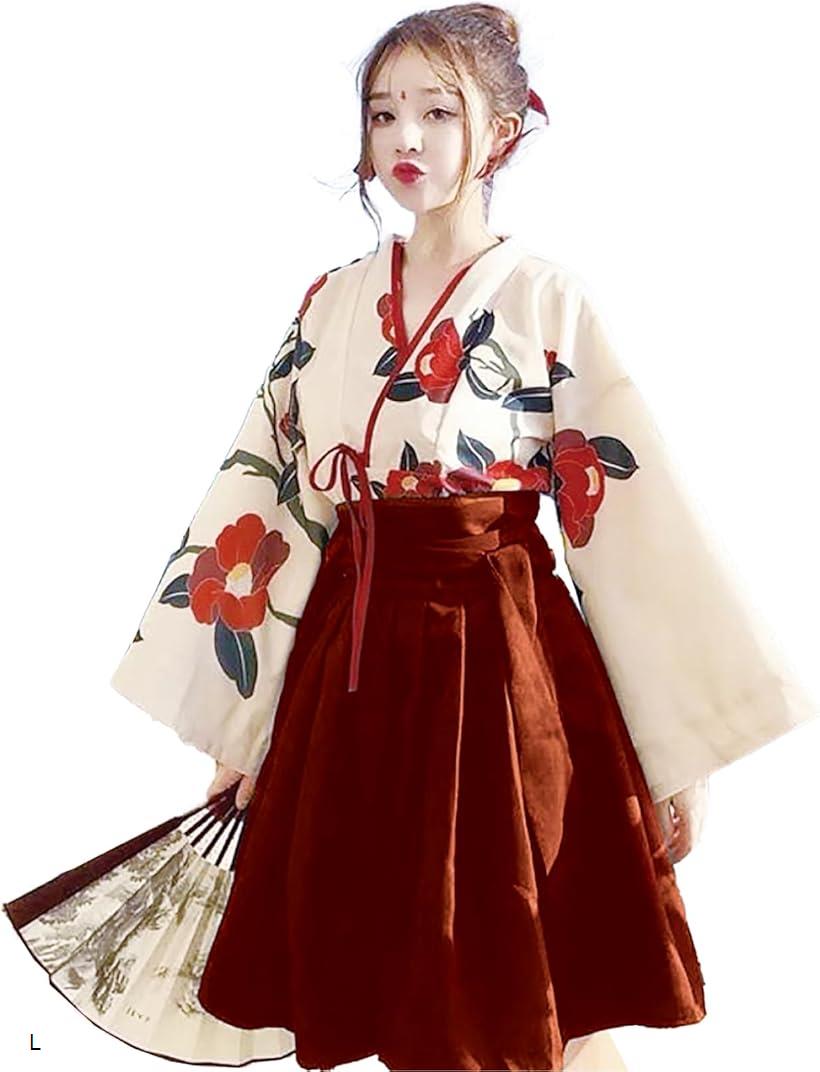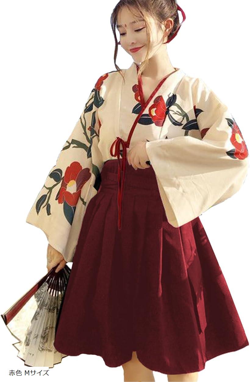 【楽天ランキング1位入賞】大正ロマン レトロ コスプレ アニメ アジアン 袴 ショート丈 浴衣 和装 和服 着物 女装 イベント パーティー ハロウィン 花柄 アクセサリー付き 赤・レッド Lサイズ M S L