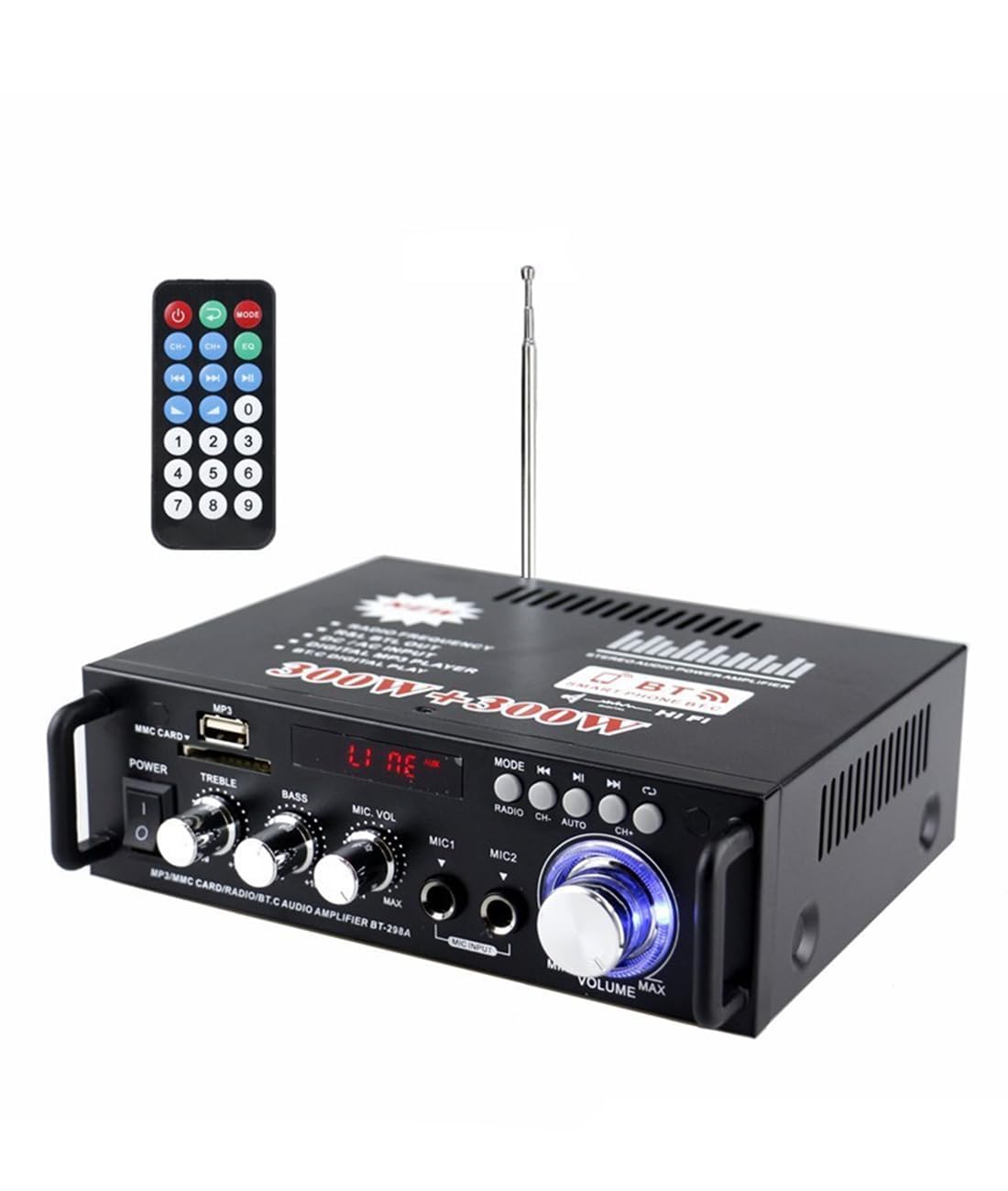 ・【Bluetooth 5.0】:音声ミキシングデバイスにはBluetoothワイヤレス音楽ストリームが搭載されており、受信範囲は12メートルを超えています。最新のデバイス(スマートフォン、iPad、iPhone、パソコンなど)とのペアリングは簡単です。・【高音質】高性能チップを採用し、まるでCD音源を再生しているかのような高音質サウンドを実現! 40 w+40 wのパワーで大音量体験ができます 。・【USBメモ対応】USBメモリに保存されたMP 3ファイルを直接再生でき、手間をかけずに高音質で音楽ファイルを楽しむことができます。・【簡単な制御】モード制御用の明確で応答性の高いボタンを備え、改善されたプロコンパクトなサウンドアンプです。つまみはマイクのエコー/音量、低音、高音、主音量を制御することができます。同時に付属しているリモコンは、遠隔操作ができ、より便利で迅速です。・【12ヶ月の品質保証】:商品に不具合や使用方法が不明な場合は、必ずご連絡ください。早急に問題を解決させていただきます。購入後12ヶ月の保証をお楽しみください。ご安心して購入してください。商品に不具合や使用方法が不明な場合は、必ずご連絡ください。早急に問題を解決させていただきます。購入後12ヶ月の保証をお楽しみください。ご安心して購入してください。