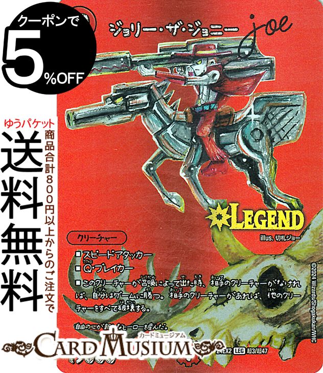 デュエルマスターズTCG 「天下夢双!!デュエキングDreaM 2024」(DM24-EX2)収録 ■カード名:ジョリー・ザ・ジョニー Joe ■Card Name:Jolly the Johnny Joe ■レアリティ:デュエキングMAXカード ■種類:クリーチャー ■文明:火文明 ■種族: ■パワー:19000 ■コスト:(10) [特殊能力] ■スピードアタッカー ■Q・ブレイカー ■このクリーチャーが召喚によって出た時、相手のクリーチャーがなければ、自分はゲームに勝つ。相手のクリーチャーがあれば、他のクリーチャーをすべて破壊する。 ★当店のシングルカードはデッキ,パック開封品です。100円以上または、レア以上のカードはカードプロテクター(スリーブ)にて管理保管されています。