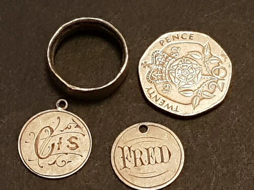 ヴィクトリア銀貨3枚をジュエリーに加工 - リングと刻印入りペンダント