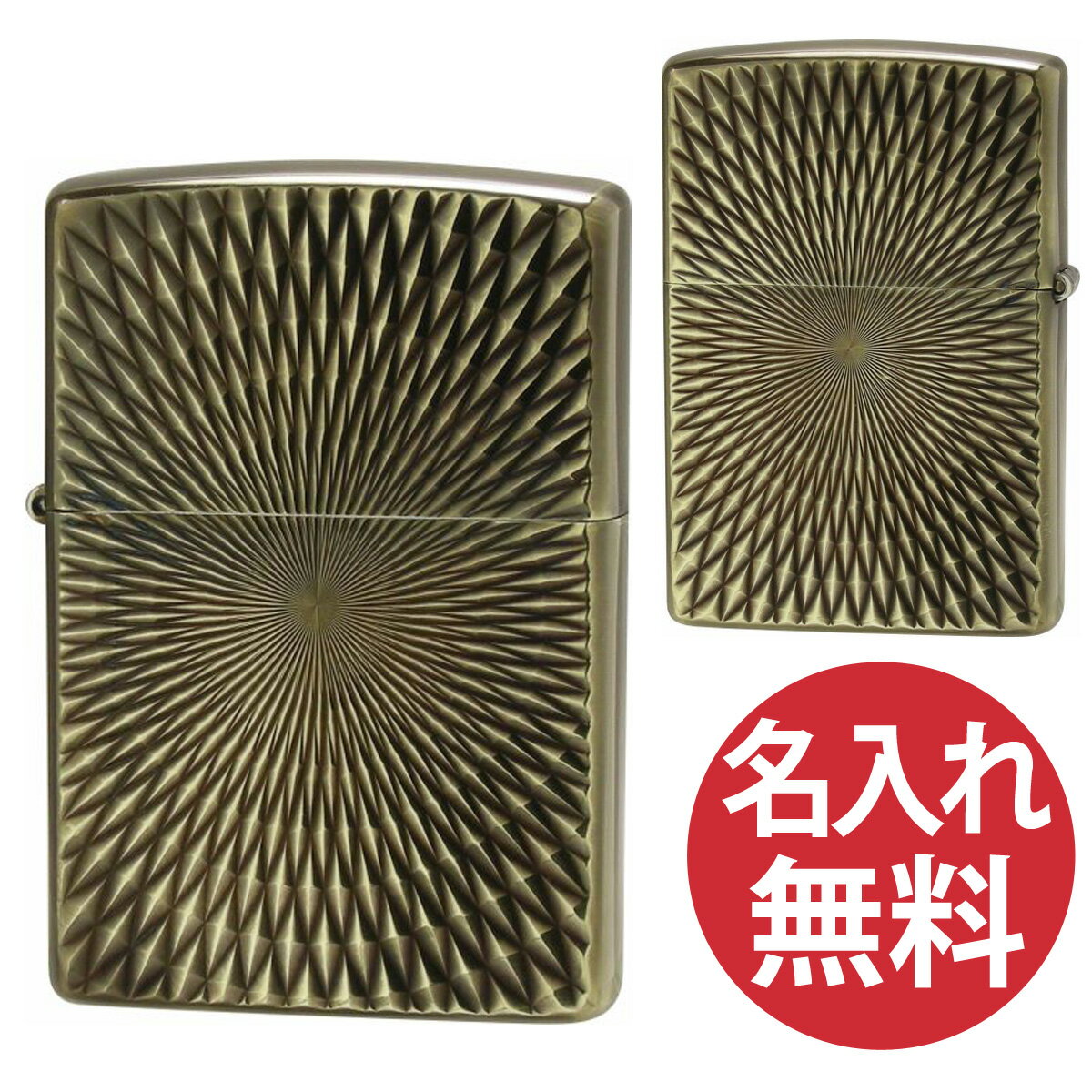 名入れオプション この商品は【名入れオプション】をライターと一緒にご購入いただくことで名入れが可能です。アイコンをクリックしてご確認下さい。 ユーズド加工を施し、3面にメタルを貼り付けたワイルドなZippo。ヴィンテージ感を出すためにこだわりの手作業仕上げ!Zippo毎に風合いが異なります。まるで骨董品のようです。人気だったデザインの復刻版。 ケース形状:レギュラー・ケース 加工表面処理:アンティークブラス|メタル オイルや替え石(フリント)、替え芯(ウィック)等、Zippoに欠かせない消耗品やアクセサリーを取りそろえております。簡易ラッピング¥100(税別)とオイルとフリントがセットになったZippo専用ギフトボックス・ラッピングをご用意しております。お気軽にお申し付けください。 ■補足※パソコン、OS、プラウザの環境により実物と若干色合いが異なる場合があります。※ボトム(底部)刻印は製造年月を表しています。在庫は常に流動しており、実際の商品とは異なる場合があります。※ZIPPOケース内側は、通常メッキ等の処理はされておりません。その為、真鍮が酸化(腐食)し汚れに見える場合がございます。※ZIPPOケースとインサイドユニットは別々にストックされ、出荷時に組み合わされます。その為、それぞれの製造年が異なる場合がございます。 ■在庫・納期について複数の店舗で在庫を共有しております。在庫はリアルタイムで管理し、細心の注意を払っておりますが、わずかなタイムラグや、ご注文が集中した時など商品をすぐご用意できない場合がございます。その場合、改めて納期をご連絡致します。あらかじめご了承下さいませ。 ギフト対応