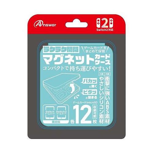 ■マグネットで開閉!ケースの開閉がしやすいマグネットタイプを採用。しっかりと閉じられているので、ふとした拍子にカードケースが開いて中身を落下させてしまうトラブルを防止します。■出し入れしやすいシリコン製!ゲームカードを出し入れしやすく、シリコン製でゲームカードやmicroSDカードにも優しい加工です。■Switch2・SwitchゲームカードやmicroSD EXPRESS・microSDカードを12枚収納可能!Switch2または、Switchのゲームカードが12枚収納可能!microSD EXPRESSカード・microSDカードも12枚収納可能です。■カード収納向きを同じに!カード収納を同じ向きにしておりますので、開いた際の絵柄の向きが統一され、使いたいゲームカードがどこに収納しているのかすぐにわかります。対応機種 : Switch2用ゲームカード・Switch用ゲームカード※製品の仕様及び外観は予告なく変更する事があります。※本製品はアンサーオリジナル製品であり、ライセンス製品ではありません。ANS-SW170BK