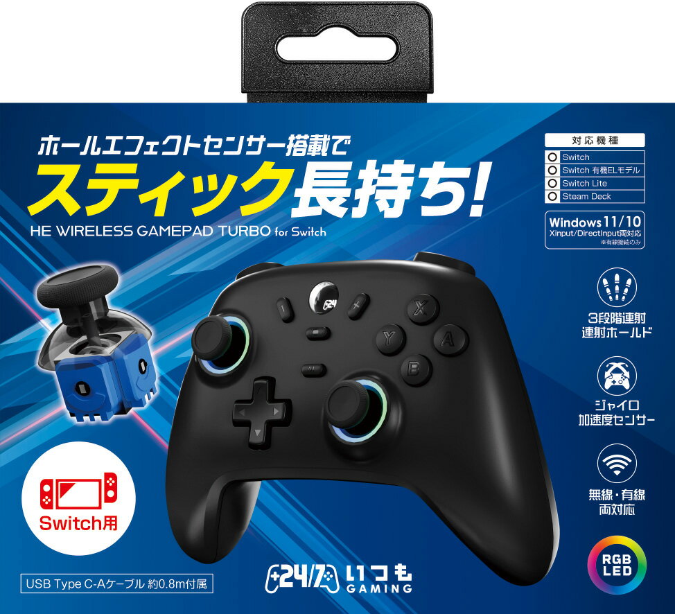 【返品種別B】□「返品種別」について詳しくはこちら□「おひとり様3点まで」2024年11月 発売※画像および仕様は開発中のものです。改良のため予告なく変更する場合がございます。◇◆商品紹介◇◆ホールエフェクトセンサーを採用したワイヤレスコントローラー●ホールエフェクトセンサーを搭載したSwitch用コントローラー! ●3段階の連射・連射ホールド機能を搭載! (5・12・25連射/秒)●7種類のモードに調整できるRGBライトで気分も盛り上がる! ●加速度・ジャイロセンサー対応●無線・有線両対応【ホールエフェクトセンサーの特長】磁場を利用して物理的な接触無しで検出を行うため、摩耗や劣化が少なく、ドリフトが起こりにくい! ※ホールエフェクトセンサーが搭載されているのはジョイスティック部分のみです。【同梱物】Switch用 HEワイヤレスゲームパッドTurbo ブラックUSB Type C-Aケーブル(約0.8m)◆製品詳細◆対応機種 : Switch / PC (Win10/11)ケーブル長 : 約0.8mおもちゃ>TVゲーム>Nintendo Switch>周辺機器・アクセサリー>コントローラー