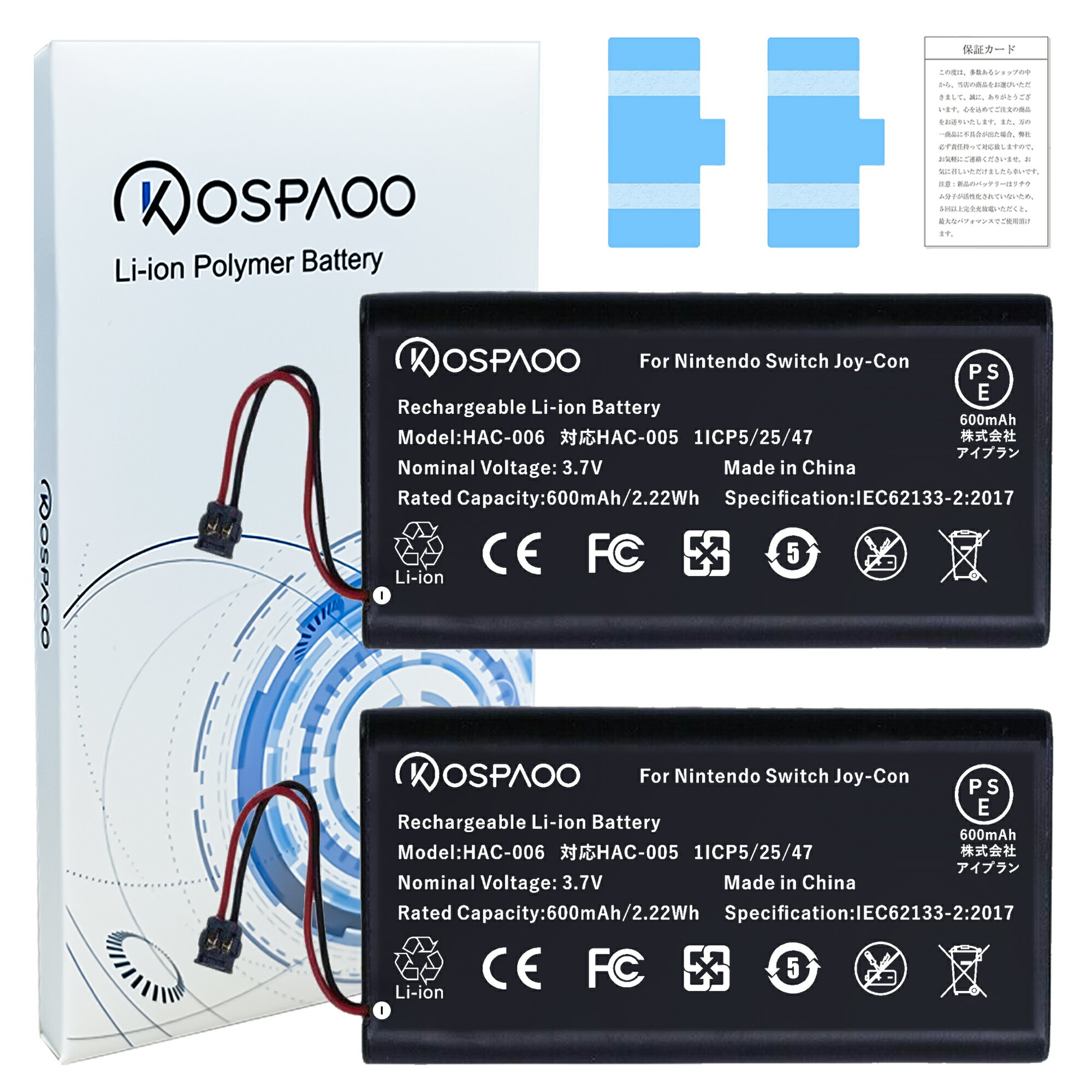 【2個セット】KOSPAOO for Nintendo Switch Joy-Con バッテリー交換 大容量600mAh 増量14% 3.7V HAC-006電池 PSE認証 適用HAC-015/HAC-016機種 互換修理用 Rechargeable Li-ion Battery 高温・低温耐性 600~800サイクル寿命 適用Nintendo Switch Joy-Con電池【No Tool】