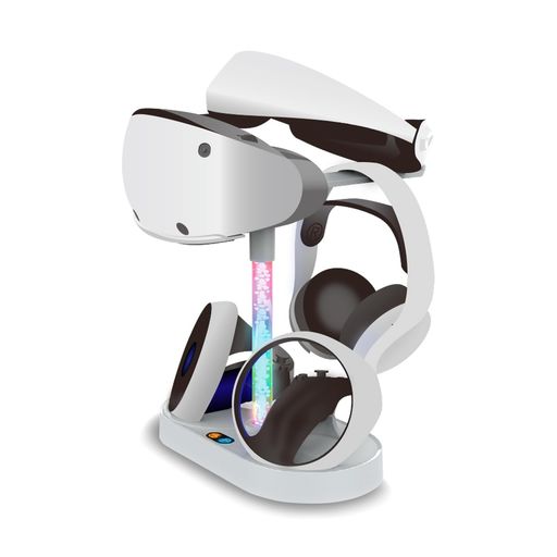【PSVR2用充電ディスプレイスタンド】本製品は、PSVR2の[VRゴーグル][コントローラーx2][ヘッドセット]をまとめて充電・収納、ディスプレイできる便利なスタンドです。中央のライトバーは美しくグラデーションに光る機能がついており、利便性だけでなく、見た目にもこだわりたい方へオススメです! 【置くだけ充電】コントローラーの充電ポートにはマグネットコネクタ式を採用。コントローラーのType-Cポートにコネクタを装着する事により、置くだけで充電が可能となっております。Type-Cマグネットコネクタは4つ付属されておりますので、別途ご用意は不要です。 【10パターンに光るライトバー】中央のバーは、デスクで映えるライトバーとなっており、置くだけで気分があがります8分音符光りのパターンは全10種。照明スイッチで【グラデーション右向き矢印点滅右向き矢印赤右向き矢印緑右向き矢印青右向き矢印黄右向き矢印水色右向き矢印紫右向き矢印白右向き矢印オフ】と変化させることができ、お部屋やその時の気分に合わせて楽しむことができます! 【USB2.0データ転送機能】本製品は、PS5と接続してデータ転送ができるUSB2.0ポートがついております。※充電ポートとしてはご使用になれません。