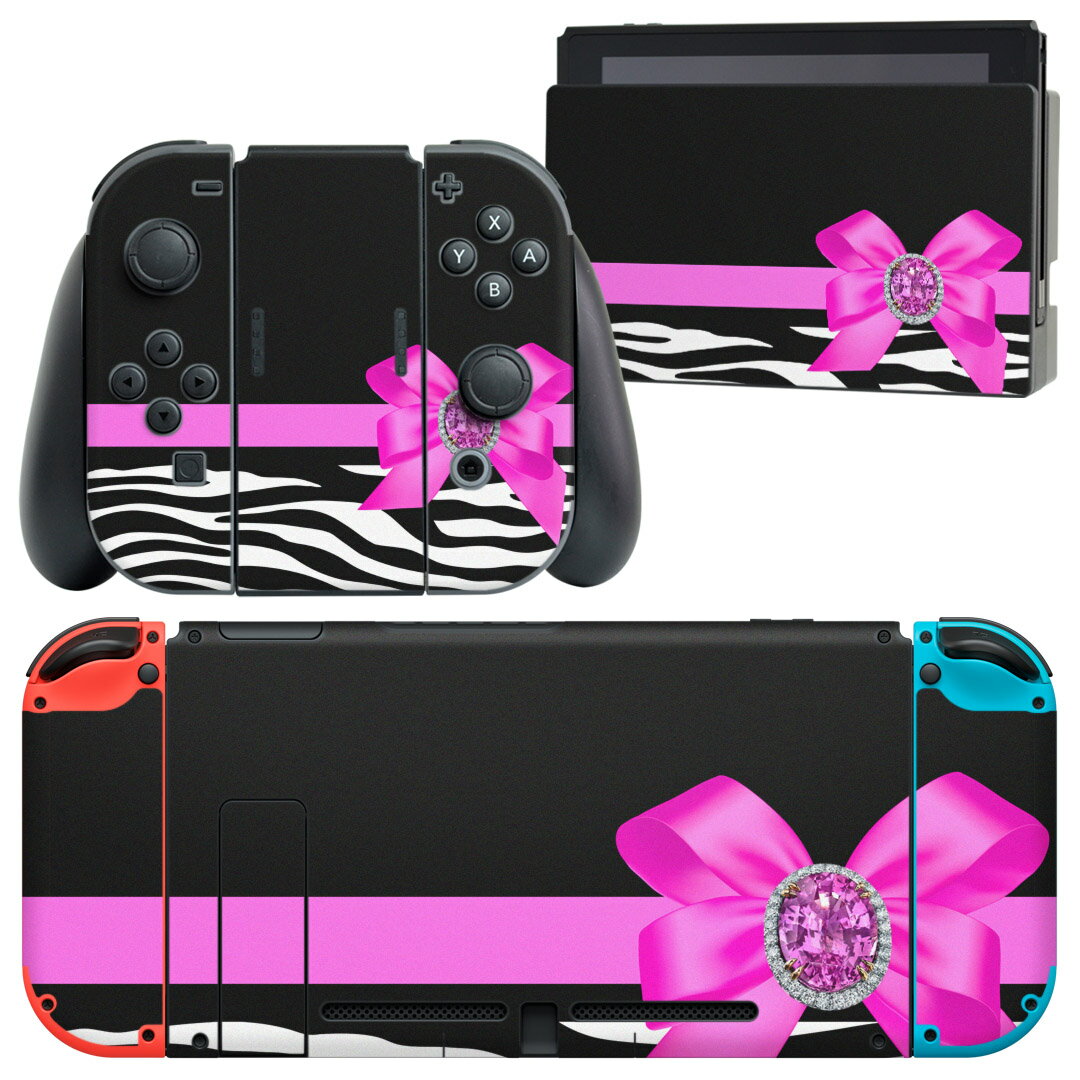 igsticker Nintendo Switch 用 デザインスキンシール 任天堂 ニンテンドー スイッチ 専用 本体ドック Joy-Con Joycon ジョイコン 専用 ゲーム機 カバー アクセサリー フィルム ステッカー 004729 アニマル ゼブラ リボン ピンク