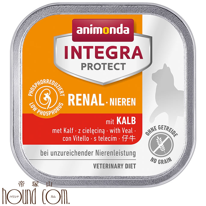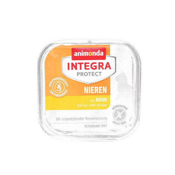 ※こちらの商品は療法食です。かかりつけの獣医師とご相談の上お使いください。 ※インテグラプロテクトシリーズは、以前よりシルバーのアルミトレーでしたが、SDGSの観点から、ゴールドが混在して販売をしてくとanimonda社から報告がございました。商品自体に変更はなく、これまで通りのものとなります。あらかじめご了承ください。 ※輸入品のため容器が多少凹んでいる場合がありますが、中身に問題はございません。予めご了承ください。 ※原材料などの情報は、メーカー公式サイトの通りに記載しています。随時切替えを行っておりますが、お届けする商品のラベルと差異が生じる場合がございますので予めご了承ください。 内容量 100g 原材料 肉類(牛、鶏、豚)、野菜(ポテト)、油脂類(キャノーラオイル)、野菜副産物、ミネラル類、ビタミンD3 ※タンパク源:牛、鶏、豚 栄養添加物(1kgあたり):ビタミンD3 200IU、ヨウ化カルシウム 0.4mg、銅アミノ酸水和物 2mg、硫酸マンガン一水和物 2mg、硫酸亜鉛一水和物 16mg 分析値 タンパク質 7.8%、脂肪 11.5%、粗繊維 0.5%、粗灰分 1.3%、水分 76%、カルシウム 0.22%、リン 0.16%、ナトリウム 0.16%、カリウム 0.16%、リノール酸 1.8%、タウリン 0.7g/kg カロリー 127kcal/100g 原産国 ドイツ アニモンダ インテグラプロテクト 腎臓ケアシリーズ ドライフード 300g (86929) / 1.2kg (86930) ウェットフード 鶏 100g (86800) ウェットフード 豚 100g (86801) ウェットフード 牛 100g (86802) ウェットフード 七面鳥のみ 100g (86803) ウェットフード 仔牛 100g (86615) ウェットフード カモ 100g (86616) ウェットフード 鶏 85gパウチ (86632) ウェットフード 牛 85gパウチ (86633) おやつ ヤミービッツ 120g (86935) ※この商品はメール便(日本郵便)対象外の商品です。通常宅配でのお届けとなりますのでご注意下さい。 >返品・交換について「INTEGRAR PROTECT RENAL NIEREN(インテグラ プロテクト 腎臓ケア)」は、慢性腎不全のネコ(慢性腎臓病=CKD)に対処するために特別に開発された療法食。 タンパク質とリンの含有量を減らすことにより腎機能が支えられます。また、グレインフリーなので穀物不耐性の猫にもオススメです。 ●慢性腎不全&穀物アレルギー ●低リン ●低タンパク ●グレインフリー animonda(アニモンダ)について 人工着色料、人工保存料、人工香料、遺伝子組み換え食品を一切、使わない安心でナチュラルなフード作りに定評がある、ドイツが生んだ世界的なプレミアムフードのブランド「アニモンダ」。 アニモンダ社のあるドイツでは、ペットフードに人間と同じレベルの原材料を使用しなければいけないという法律があり、特に安心して与えることができるオススメフードです。 ※フードの色は、食材の自然の色です。着色料などは一切使用しておりません。 ※ゼラチン、増粘多糖類、保存料などの添加物は一切使用しておりません。 ※正規輸入品は温度・品質管理が適正に行われています。 取扱商品はすべてメーカーの指定する販売代理店より入荷した正規品です。並行輸入商品は取り扱っておりません。 ●給餌量(体重/1日あたり): 3kg/150g 4kg/185g 5kg/230g ●推奨使用期間:最初は6ヵ月以内。 ・使用前および期間を延長する場合には獣医師に相談することをおすすめします。 ・症状が改善した場合は無期限に使用できます。