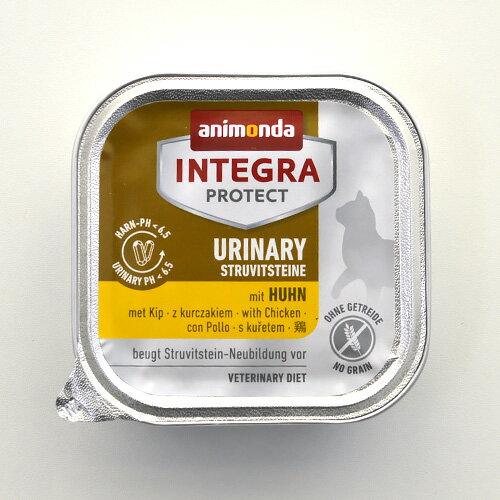 ※缶詰、トレイ等のフードについて缶詰、トレイ等のフード類は、空気圧や流通過程の衝撃等の原因により、へこみなどが生じる場合がございますが、内容に問題はございません。予めご了承くださいませ。 アニモンダ インテグラの食事療法食は、"美味しい"食事療法食です。 いくらフードの成分が良くても、食べなければ意味がありません。 アニモンダの食事療法食は、まずおいしいフードであることを一番に考え、それでいて食事療法食として成り立つように考えられています。 ストルバイト結石を形成しにくくするために特別に開発された猫用療法食 マグネシウムやリンなどのミネラルをバランスよく供給することで、ネコの尿pH6.5以下6.4以上の維持を助けます。 尿pH6.5以下6.4以上の維持を助け、ストルバイト結石を形成しにくくします 適切なミネラル配分 大豆、砂糖不使用 香料、着色料、保存料不使用 【シュウ酸カルシウム結石向け製品とストルバイト結石向け製品の違いについて】 尿路結石には、尿pH値が大きく関係しています。 pH6.4より小さくなるとシュウ酸カルシウム結石のリスクが増えpH6.8より大きくなるとストルバイト結石のリスクが増えます。 そのためストルバイト結石対応商品は、シュウ酸カルシウム結石のリスクを抑えつつも、ストルバイト結石に効果的に働くようにpH6.5以下6.4以上の維持を目指す調整がなされています。 シュウ酸カルシウム結石対応商品は、ストルバイト結石のリスクを抑えつつも、シュウ酸カルシウム結石に効果的に働くようにpH6.7の維持を目指す調整がなされています。 効果的な食事となるよう、結石の種類別に製品が分かれています。 アニモンダ インテグラプロテクトは、特定の疾病等に対応するために栄養バランスを考慮した、毎日の主要な食事として与えられるフードです。 原材料:肉類(牛、鶏、豚)、野菜(ポテト)、油脂類(キャノーラ油)、ミネラル類、野菜副産物、dl-メチオニン、硫酸カルシウム、ビタミンD3 分析値(1kgあたり):タンパク質 9.5 %、脂肪分 6.5 %、粗繊維 0.6 %、粗灰分 1.4 %、水分 80 %、カルシウム 0.19 %、リン 0.17 %、ナトリウム 0.18 %、マグネシウム 0.013%、カリウム 0.25 %、塩化物 0.18 %、硫黄 0.19 %、タウリン 0.75 g/kg 栄養添加物(1kgあたり):ビタミンD3 200IU、ヨウ化カルシウム0.4mg、銅アミノ酸水和物2mg、硫酸マンガン一水和物2mg、硫酸亜鉛一水和物16mg カロリー(100gあたり):100kcal 内容量:100g 生産国:ドイツ 1日推奨給餌量:体重3kg 180g、体重4kg 220g、体重5kg 175-230g、体重6kg 250g 推奨使用期間について 初回6ヵ月以内。使用開始前および使用期間を延長する場合には使用前に獣医師に相談することをおすすめします。 症状が改善した場合は無期限に使用できます。 症状別食事療法のための各疾患特化食事プログラム インテグラプロテクトシリーズは長期的にペットの病気と向き合うアニモンダの療法食シリーズです。 アニモンダの「美味しさ」そのままで、疾患別に商品を取り揃えています。 長期的に向き合う為、「胃腸ケア」シリーズ以外の商品は、症状のあるイヌまたはネコが生涯そのフードのみを食べて長期的に生活できるよう作られています。 ※胃腸ケアは症状が治まった後も摂取を続けると栄養バランスが保てなくなる可能性がありますので症状が治まり次第、通常食へ戻してください。 アニモンダの療法食 インテグラプロテクトはアニモンダの療法食です。 昨今、医療技術の進歩やフードの品質向上等によりペット達の寿命が長くなりました。 寿命が長くなったことにより高齢化も進み、複数の病気を併発してしまうケースも多くなってきており、新たな課題になっています。 この療法食シリーズは、病気や年齢を問わず生涯を通して給餌できます。(胃腸ケアシリーズを除く。) 獣医学に基づいた適切な療法食 インテグラプロテクトはアニモンダの獣医師監修のもと開発された、獣医学に基づいた適切な食事療法食です。 それぞれ疾患、症状ごとに対応した栄養ニーズを満たす最適なレシピで開発されています。 例えばインテグラプロテクト腎臓ケアは、慢性腎不全(慢性腎臓病=CKD)に対応するためタンパク質とリンの含有量を減らした療法食となっています。 アニモンダの「美味しさ」そのまま 「美味しい」療法食、それがアニモンダ インテグラプロテクトの特徴です。 アニモンダの厳選された素材とレシピにより生まれる「美味しさ」は療法食でも、もちろん失われていません。 どんなに身体によくとも、「美味しく」なければ食は進まないもの。 病気を併発してしまったペット達でも、「美味しく」安心して食べられるのがインテグラプロテクトです。 獣医師によって開発された特別な食事 アニモンダのインテグラプロテクトはアニモンダと獣医師によって開発された療法食です。 ペットたちが悩む多くの病気で獣医学に基づいた適切な食事として療法食が必要です。 それぞれの病気に合わせた特定の栄養ニーズを満たす適切な食事が獣医師によ