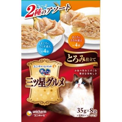 【エントリーP5倍】ユニ・チャーム 銀のスプーン三ツ星グルメ とろみ仕立て まぐろにしらす添え&まぐろにささみ添え (35G×8袋入)
