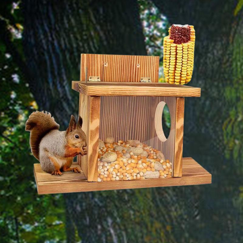 屋外用木製リスフィーダー リス用給餌ボックス 自然素材で丈夫な裏庭 ガーデン パティオ用 餌やり簡単設計で野生リス観察に最適な給餌器具