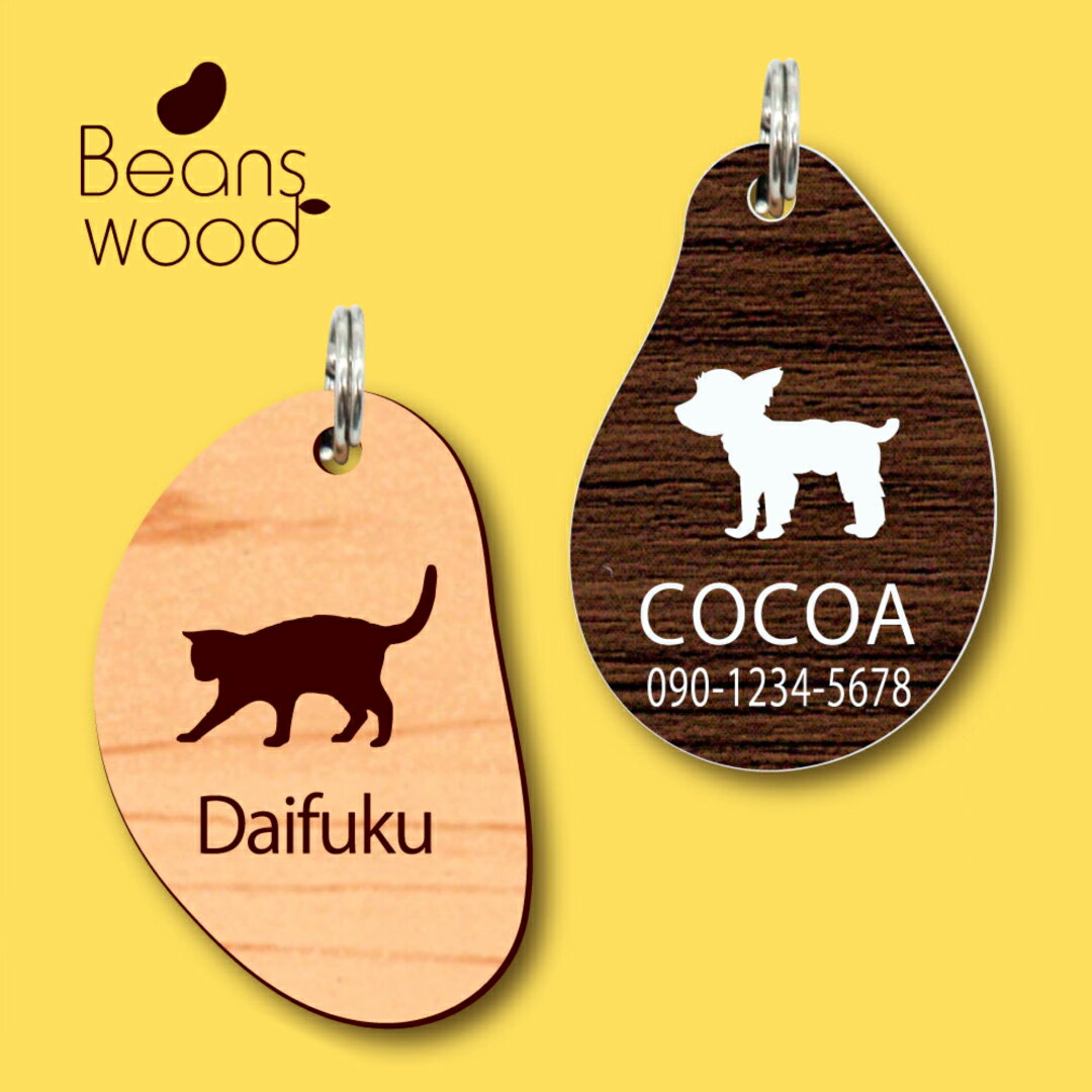 PET SMILE 315ペット オーダーメイド グッズbeans 迷子札ビーンズウッド ナチュラル/ダークブラウンPESPS31516_01文字が消えない彫刻仕上げ!お豆や水滴のようなかわいい形の迷子札