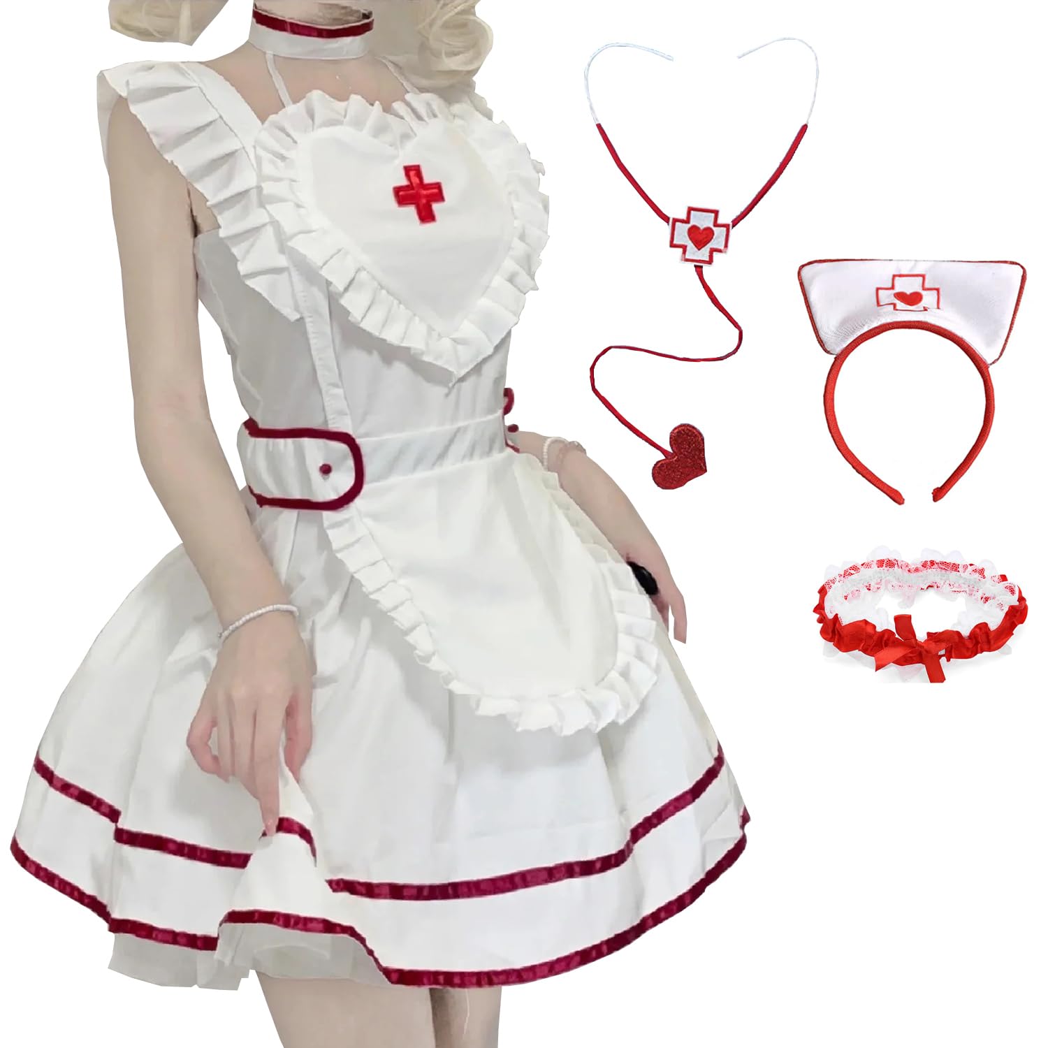 商品情報商品の説明主な仕様 【商品8点セット内容】: ワンピース+取り外し可能な袖*2点+カチューシャ+レッグリング*2点+おもちゃの聴診器+レースニーハイタイツ. コスプレに必要なものが全てセットになっており、お手軽に可愛いナースに変身できます。人気のナースコスプレを気軽に演出できます。【ハロウィンナース服 】 小物も充実したセット内容で豪華なナースコスプレ☆ 簡単に目を引くセクシーな「白衣の天使」に変身♪ 真っ赤なトリムが白によく映え、アクセントに♪ 聴診器・ナースキャップ風カチューシャもついて大満足! 憧れのナースコスプレが簡単にできちゃいます。【肌にやさしく心地よい】: 高品質で柔らかい素材を使用し、繊細な感触が肌に馴染み、通気性が良く肌に刺激がありません。長時間着用しても心地よく快適で、ロマンチックで情熱的な雰囲気に心ゆくまで浸れます。 着心地の良さで、大切な時間を快適にお過ごしいただけます。【イベントで大活躍】 ハロウィンや仮装パーティにはもちろん、クリスマス、忘年会、新年会、学園祭 、文化祭、演劇、撮影 、発表会、宴会など、様々なイベントの仮装グッズとしてご使用いただけます。【安心サービス】商品の検品には必ず重ねて行っておりますが、万が一、お注文内容と異なる場合・初期不良・破損の場合、出来るだけお早めにご連絡ください。48時間内で返信します。交換また返品いたします。 こちら誠意を持って対応させていただきます