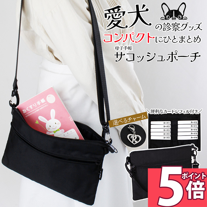 【ポイント10倍 26日1:59迄】 お薬手帳 診察券ホルダー サコッシュ 母子手帳 ケース レディース メンズ ショルダー バッグ ポーチ 軽量 ペット うちの子 グッズ 犬 イニシャル チャーム付き 多機能 カードケース ブラック 黒/母子手帳サコッシュポーチ