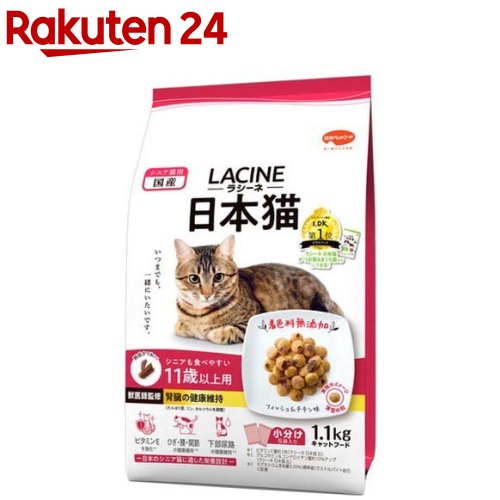 お店TOP>ペット用品>猫用食品(フード・おやつ)>プレミアム・キャットフード>プレミアム キャットフード(高齢猫 シニア)>ラシーネ 日本猫 11歳以上用 (1.1kg)【ラシーネ 日本猫 11歳以上用の商品詳細】●日本猫に適した栄養設計。●11歳以上のシニア猫用。【ラシーネ 日本猫 11歳以上用の原材料】穀類(トウモロコシ、小麦粉、コーングルテンミール、パン粉)、肉類(牛肉粉、豚肉粉)、魚介類(フィッシュミール、カツオ加工品(熟成カツオ)、フィッシュパウダー、マリンコラーゲン)、油脂類(植物性油脂、動物性油脂)、L-カルニチン、ビール酵母(β-グルカン源)、オリゴ糖、ミネラル類(カルシウム、カリウム、ナトリウム、クロライド、銅、亜鉛、ヨウ素)、ビタミン類(A、B1、B2、B6、B12、D、E、K、ニコチン酸、パントテン酸、葉酸、コリン)、アミノ酸類(タウリン、トリプトファン、メチオニン)、pH調整剤、酵母細胞壁、N-アセチルグルコサミン、コンドロイチン、酸化防止剤(ミックストコフェロール、ローズマリー抽出物)【栄養成分】たんぱく質26.0%以上、脂質10.0%以上、粗繊維3.0%以下、灰分9.0%以下、水分10.0%以下、カルシウム0.7%以上、リン0.6%以上、ナトリウム0.5%(標準値)、マグネシウム0.10%(標準値)【保存方法】直射日光をさけ、涼しく乾燥した場所に保存してください。開封後は虫などが入らないように注意し、お早めにお与えください。【原産国】日本【ブランド】ラシーネ【発売元、製造元、輸入元又は販売元】日本ペットフードこちらの商品は、ペット用の商品です。リニューアルに伴い、パッケージ・内容等予告なく変更する場合がございます。予めご了承ください。(キャットフード 日本猫 三毛猫 ハチワレ キジトラ 国産 小分け)日本ペットフード140-0002 東京都品川区東品川2-2-4 天王洲ファーストタワー5階0120-301-908広告文責:楽天グループ株式会社電話:050-5577-5043[猫用品/ブランド:ラシーネ/]
