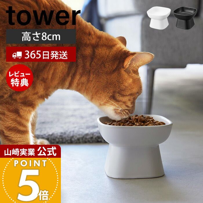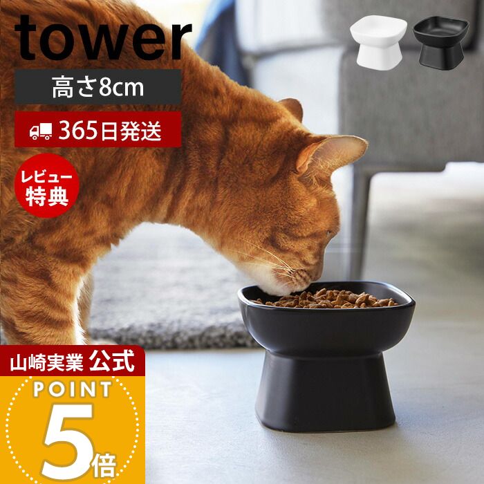 【365日出荷&当店限定特典付き】山崎実業 食べやすい高さ陶器ペットフードボウル タワー tower 公式 ペット用食器 エサ入れ 水入れ 食器スタンド 猫 犬 フードボウル 脚付き 高さ8cm 陶磁器 ホワイト ブラック 1779 1780
