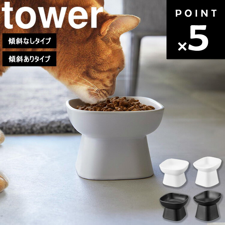 【365日出荷&当店限定特典付き】山崎実業 食べやすい高さ陶器ペットフードボウル 斜めトール タワー tower 公式 ペット用食器 エサ入れ 水入れ 傾斜 猫 犬 フードボウル 脚付き 高さ11.5cm ホワイト ブラック 1781 1782