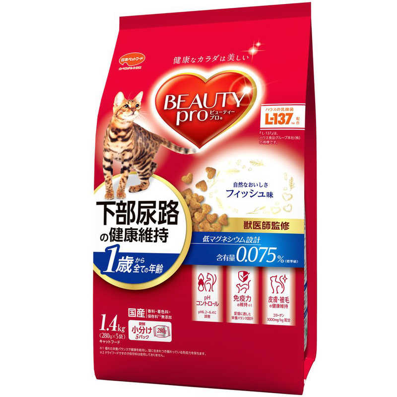 【商品解説】「実感が欲しい、あなたへ」獣医師監修のビューティープロ。皮膚の健康と毛艶の維持にマリンコラーゲン3000mg/kg、ヒアルロン酸配合。ストルバイト結石に配慮し、マグネシウムを0.075%(標準値)に調整。さらに、pHコントロールし、メチオニン強化。1歳からの必要な栄養素を含んだフィッシュ味。天然食物繊維が毛玉の排泄を助ける毛玉対応。着色料無添加、食べやすいハート型。新鮮小分け280g×5袋。【スペック】●型式:(BPキヤツトFLUT1.4KG)●JANコード:4902112043110【注意事項・特記事項】※増量キャンペーンやパッケージリニューアル等で掲載画像とは異なる場合があります。※予告なく仕様・デザイン等が変更になることがありますので、ご了承ください。※開封後の返品や商品交換はお受けできません。この商品は宅配便でお届けする商品です出荷可能日から最短日時でお届けします。※出荷完了次第メールをお送りします。配送サービス提供エリアを調べることができます「エリア検索」をクリックして、表示された画面にお届け先の郵便番号7桁を入力してください。ご購入可能エリア検索お買い上げ合計3,980円以上で送料無料となります。※3,980円未満の場合は、一律550円(税込)となります。●出荷可能日から最短日時でお届けします。(日時指定は出来ません。) ※お届け時に不在だった場合は、「ご不在連絡票」が投函されます。 「ご不在連絡票」に記載された宅配業者の連絡先へ、再配達のご依頼をお願いいたします。●お届けは玄関先までとなります。●宅配便でお届けする商品をご購入の場合、不用品リサイクル回収はお受けしておりません。●全て揃い次第の出荷となりますので、2種類以上、または2個以上でのご注文の場合、出荷が遅れる場合があります。詳細はこちら■商品のお届けについて商品の到着日については、出荷完了メール内のリンク(宅配業者お荷物お問い合わせサービス)にてご確認ください。詳しいお届け目安を確認する1度の注文で複数の配送先にお届けすることは出来ません。※注文時に「複数の送付先に送る」で2箇所以上への配送先を設定した場合、すべてキャンセルとさせていただきます。