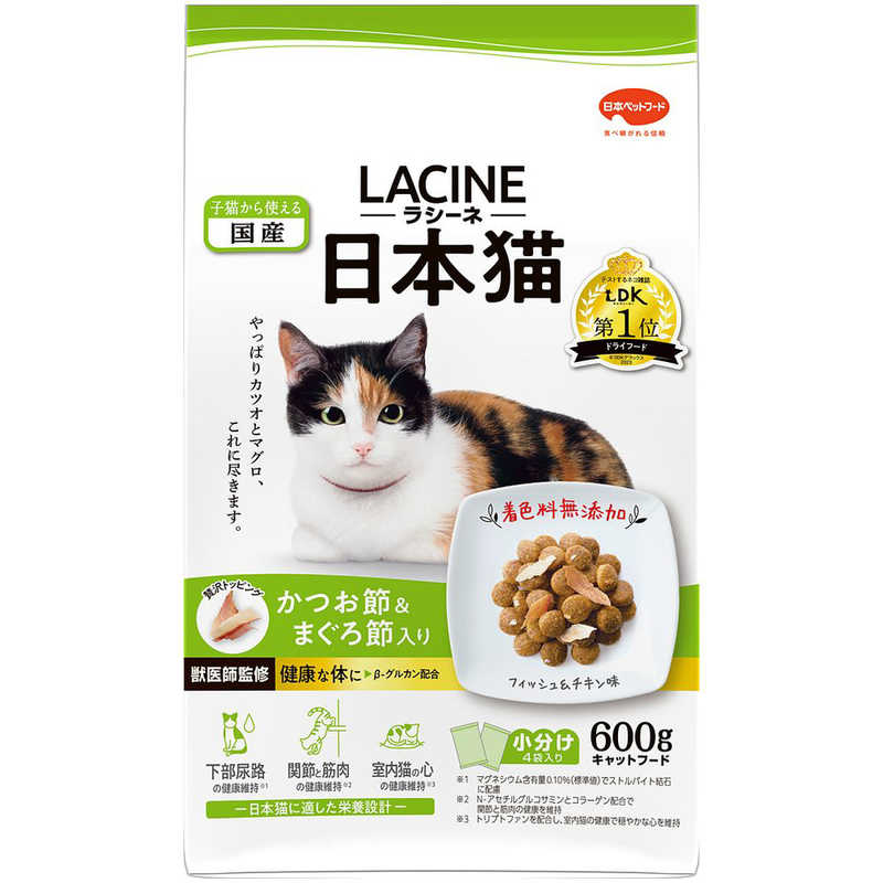 【商品解説】かつお節とまぐろ節をトッピングしたおいしい日本猫用フード。日本猫の健康な体の維持をサポート。【スペック】●型式:(ラシーネニホンネコ600G)●JANコード:4902112045411【注意事項・特記事項】※増量キャンペーンやパッケージリニューアル等で掲載画像とは異なる場合があります。※予告なく仕様・デザイン等が変更になることがありますので、ご了承ください。※開封後の返品や商品交換はお受けできません。この商品は宅配便でお届けする商品です出荷可能日から最短日時でお届けします。※出荷完了次第メールをお送りします。配送サービス提供エリアを調べることができます「エリア検索」をクリックして、表示された画面にお届け先の郵便番号7桁を入力してください。ご購入可能エリア検索お買い上げ合計3,980円以上で送料無料となります。※3,980円未満の場合は、一律550円(税込)となります。●出荷可能日から最短日時でお届けします。(日時指定は出来ません。) ※お届け時に不在だった場合は、「ご不在連絡票」が投函されます。 「ご不在連絡票」に記載された宅配業者の連絡先へ、再配達のご依頼をお願いいたします。●お届けは玄関先までとなります。●宅配便でお届けする商品をご購入の場合、不用品リサイクル回収はお受けしておりません。●全て揃い次第の出荷となりますので、2種類以上、または2個以上でのご注文の場合、出荷が遅れる場合があります。詳細はこちら■商品のお届けについて商品の到着日については、出荷完了メール内のリンク(宅配業者お荷物お問い合わせサービス)にてご確認ください。詳しいお届け目安を確認する1度の注文で複数の配送先にお届けすることは出来ません。※注文時に「複数の送付先に送る」で2箇所以上への配送先を設定した場合、すべてキャンセルとさせていただきます。
