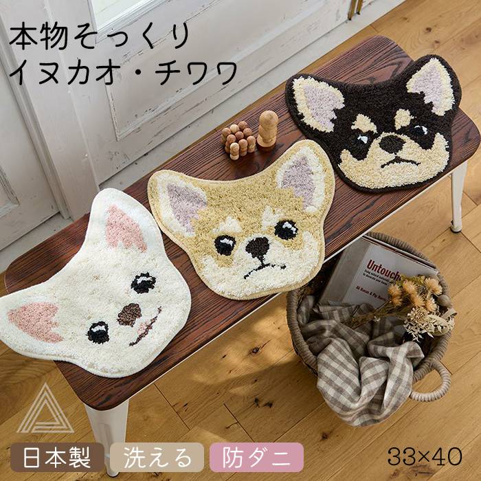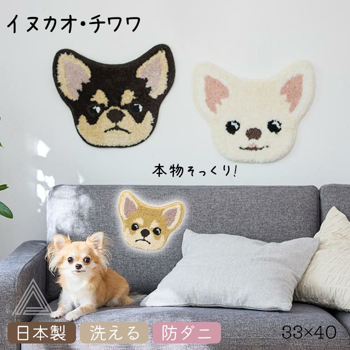 【商品番号】 SUMI005 【カラー】 50.チワワ 78.CRチワワ(クリームタン) 79.WHチワワ(ホワイト) 【サイズ】 33×40cm 【パイル長】 15/12mm 【素材】 アクリル100% 【日本製】 【コメント】 それぞれの飼い主のみなさんが一番魅力を感じるポイントを一匹ずつ表現しました! 飼い主のみなさんにとって一番かわいい「うちのペット」。 大人気のマット イヌカオ チワワに新色が登場! 大きな目と耳がポイントのチワワ。 洗える、防ダニ、すべり止め、ホットカーペット・床暖房対応 【キーワード】 イヌカオ チワワ 玄関マット チェアパッド 全3色 洗える 防ダニ すべり止め 床暖房対応 日本製 HOME イヌカオマット インテリア雑貨 おしゃれデザイン プレゼントに最適 リラックスアイテム 癒し系アイテム SNS映え ユニークギフト プレゼント ギフト 友達 大人 女性 男性 卒園 卒業 記念品 誕生日 バレンタイン お祝い グッズ チワワ雑貨 チワワグッズ