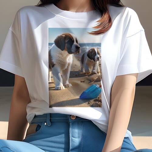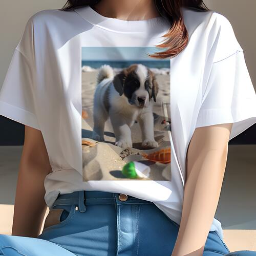 セントバーナード Tシャツ レディース 犬ファン 半袖 春夏 犬柄 プリント カジュアル かわいい 人間用 個性派 ここだけのデザイン 面白 ビーチ セントバーナード 海 砂 おもちゃ