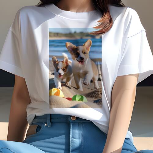 コーギー Tシャツ レディース 犬ファン 半袖 春夏 犬柄 プリント カジュアル かわいい 人間用 個性派 ここだけのデザイン 面白 ビーチ コーギー 海 砂 おもちゃ