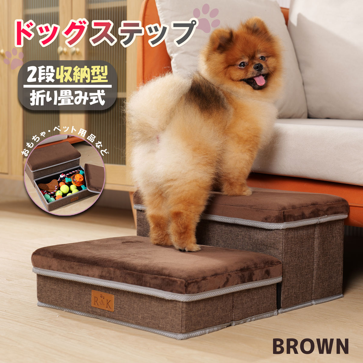 ドッグステップ 2段(収納可能) 商品内容 ドッグステップ 1段目 1個 1段目中敷き 1個 1段目上ふた 1個 ドッグステップ 2段目 1個 2段目中敷き 1個 2段目上ふた 1個 規格/原産国 組立時(2個組み立て後):幅41cm×奥行50cm×高さ21cm (原産国)CHINA カラー ショコラブラウン 素材/重量/耐荷重 素材:ポリエステル/ポリプロピレン不織布/MDF 重量:約2Kg 耐荷重:約20kg 使用用途 【店長の趣味でペット雑貨はじめました!】 ワンちゃんがソファーなどに上る際、足腰に大きな負担がかかります。少しでもワンちゃんの健康を守るべく、是非ご検討くださいませ! (特徴) ●2段分(2箱)収納型のドッグステップで、ワンちゃんの服や小物、飼い主様の荷物など、スペースを活用して収納いただけます。 ●チップウレタンと違い、1枚物のウレタンシートを使用している為、適度な硬さとクッション性で足腰の負担を軽減します。 ●1段目が奥行25cmと幅広サイズになっており、階段の勾配が緩やか。 ●クッション性がありワンちゃんの1ステップ1ステップ足の負担を軽減! ●コンパクトサイズで場所をとりません。 ●使わないときは折り畳んでおく事も可能です。 ●軽量型で組み立てや折り畳みも簡単! ●お手入れかんたん!軽く濡らして、しっかりと絞った布で汚れた場所を拭きとってください。 注意事項 ※収納型の為、重量は軽く製造されております。滑りやすい場合もございます為ペット様が上り下りをする前に中に収納いただき、ある程度の重さを確保してからご使用ください。 ・ペット以外でのご使用はお控ください。 ・製品の上に耐荷重以上の重たい物を乗せたり、過度な衝撃は与えないでください。 ・使わないときは底板を分離し、折りたたんで保管してください。 ・湿度の高い所や、火気の近くでの保管はお控ください。 (製品の変形及び、破損の原因になります。) ・ペットが嚙みつかないようご注意ください。 (嚙みついた部分の製品破損により誤飲してしまう恐れがあります。) ・直射日光への長時間の露出は変色の恐れがございます。 ・サイズはご購入前に必ずご確認いただき、ペットの体格に合う商品をお買い求めください。 ・こちらの商品は中板が入っておりますので、丸洗いはできません。 ・衛生面上、商品開封後の返品は不可となります。 (最強翌日配送対象商品に関するご案内) 最強翌日配送対象商品・対象地域に該当する場合は最強翌日配送マークがご注文カゴ近くに表示されます。 最強翌日配送可能なお支払方法は【クレジットカード、代金引換、全額ポイント支払い】のみとなります。 下記の場合は最強翌日配送対象外となります。 時間指定がある場合、 ご注文時備考欄にご記入がある場合、 決済処理にお時間を頂戴する場合、 郵便番号や住所に誤りがある場合、 最強翌日配送対象外の商品とご一緒にご注文いただいた場合、 お届け先住所文字数が40文字以上の場合