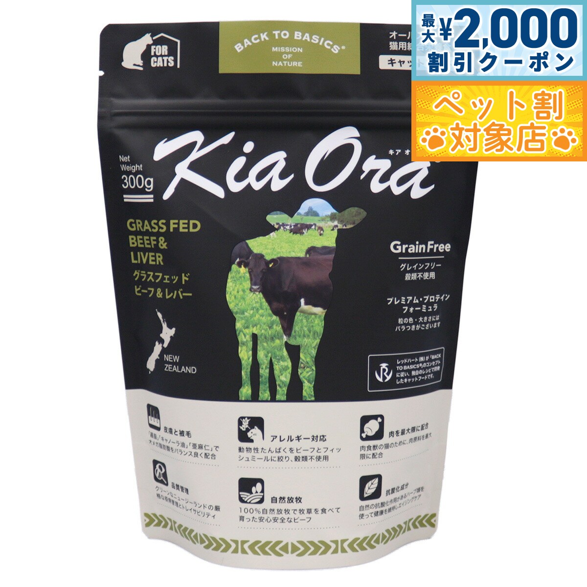 【最大2000円OFFクーポン!&店内ポイント最大59倍!本日限定!】キアオラ KiaOra キャットフード グラスフェッドビーフ&レバー 300g 猫 ドライフード 総合栄養食 無添加 グレインフリー 全猫種用 オールブリード