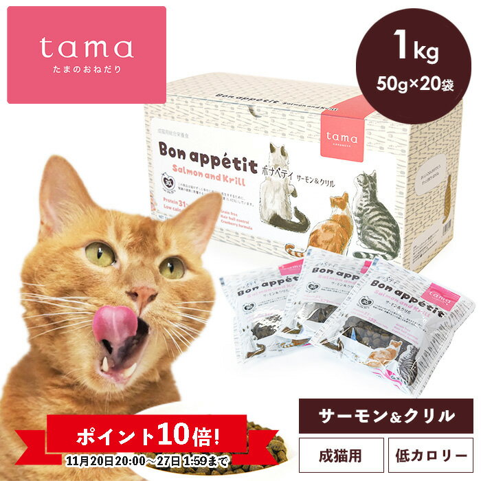 《ポイント10倍 11/20(木)20:00~27(木)1:59迄》tama たまのおねだり プレミアムキャットフード ボナペティ サーモン&クリル 1kg(50g×20袋) 猫 キャットフード ドライ グレインフリー 低カロリー 低リン 腎臓 総合栄養食 成猫 シニア猫 サーモン 魚 ヘアボールケア