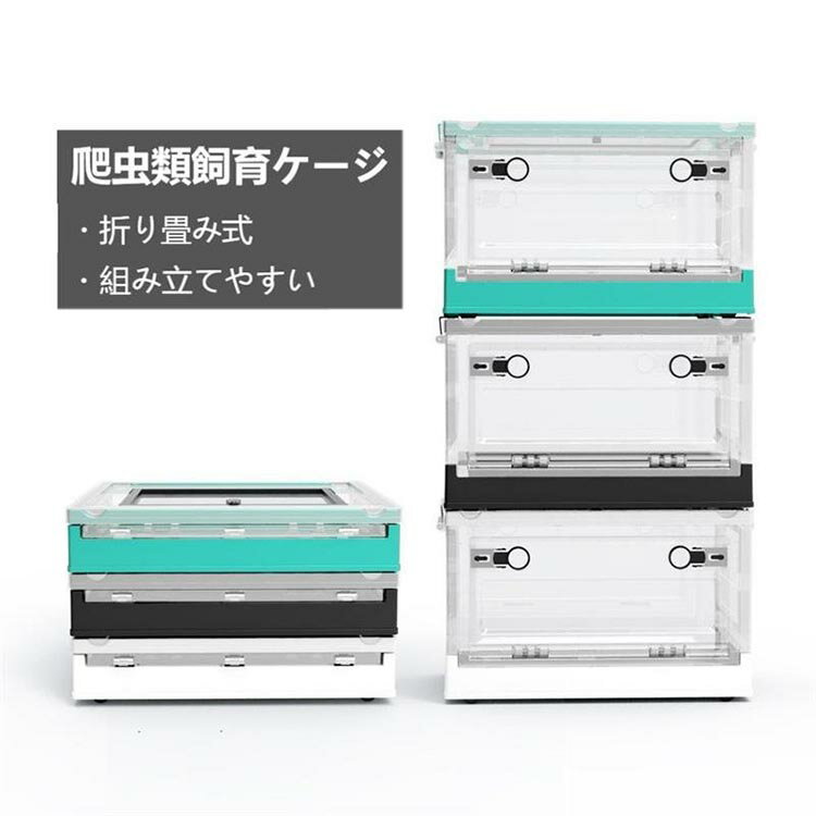 【使いやすい飼育ケージ】折り畳み式なのでほかの飼育ケースより使いやすいし収納ももっと便利です。折りたたみ状態の高さはわずか7.5cmため携帯や持ち運びに超便利!スタイリッシュで個性的なデザインでおしゃれさをアピールできます。 【通気性満点】側面には18個の通気孔がありますにもかかわらず、天面は通気性の良いメッシュを採用していため、通気性に優れています。また、天面のスクリーンメッシュは開閉脱着式なので、楽に手入れができます。ご注意:小さい爬虫類は通気口から脱走するおそれがありますのでご注意ください。 【脱着式キャスター付き】脱着式キャスター付きだから、重くなっても移動が楽々で、不要な時も取り外すことができます。また、底部にはパネルヒーターを設置しやすいフレーム形状を採用しています。 【あらゆるペットに対応】見やすい透明な樹脂製爬虫類ケージ、丈夫なので爬虫類のひっかき傷が付きにくく、ケージ内をクリアに見るため、ペットの様子を簡単に確認できます。 上部が開くことが出来るに加えて、側面にも大きな開口扉があるので、用途に合わせて使い分けることができ、大は生き物の移動や掃除時に、小は餌や水やり時に便利です。【使いやすい飼育ケージ】折り畳み式なのでほかの飼育ケースより使いやすいし収納ももっと便利です。折りたたみ状態の高さはわずか7.5cmため携帯や持ち運びに超便利!スタイリッシュで個性的なデザインでおしゃれさをアピールできます。 【通気性満点】側面には18個の通気孔がありますにもかかわらず、天面は通気性の良いメッシュを採用していため、通気性に優れています。また、天面のスクリーンメッシュは開閉脱着式なので、楽に手入れができます。ご注意:小さい爬虫類は通気口から脱走するおそれがありますのでご注意ください。 【脱着式キャスター付き】脱着式キャスター付きだから、重くなっても移動が楽々で、不要な時も取り外すことができます。また、底部にはパネルヒーターを設置しやすいフレーム形状を採用しています。 【あらゆるペットに対応】見やすい透明な樹脂製爬虫類ケージ、丈夫なので爬虫類のひっかき傷が付きにくく、ケージ内をクリアに見るため、ペットの様子を簡単に確認できます。 上部が開くことが出来るに加えて、側面にも大きな開口扉があるので、用途に合わせて使い分けることができ、大は生き物の移動や掃除時に、小は餌や水やり時に便利です。