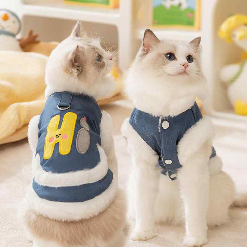 ペット服 猫 犬 中小型犬 トイプードル 秋冬 デニム ハーネスベスト スマイル かわいい おしゃれ お散歩 お出かけ ポリエステル素材 抜け毛対策 冷え対策 牽引機能付き 軽量 着脱簡単 ホワイト イエロー
