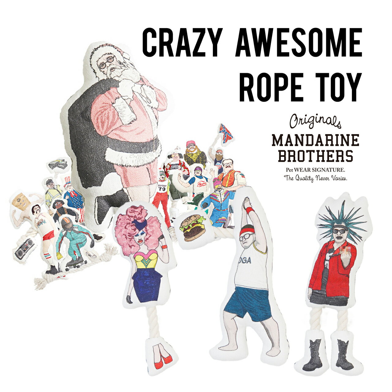 Mandarin Brothersは都会で暮らす犬たちの為にトータルでデザインを提案するブランドです。いつもの可愛いだけじゃなく、人間と同じように、お洒落でカッコイイをテーマに、安心、安全な商品の開発を進めていきます。 ・笛入り 商品説明 特徴 ・「FAT COWBOY」「CIRCUS GIRL」が仲間入り 引っ張りっこなど、ワンちゃんと一緒に楽しく遊べます!エキサイティングでファンキーに、スーパークレイジーな遊びの時間を存分に楽しみながら、愛犬との絆をより深めましょう! プープー笛入り 素材 COTTON 100% サイズ 高さ約27cm 注意 ・モニターの発色の具合によって実際のものと色が異なる場合がありますのでご注意下さい。 ・品質改善の為若干の仕様変更がおこる場合が御座いますのでご了承ください ・本品はペット用のおもちゃです。それ以外の用途でご使用にならないで下さい。 ・本品が破損した場合はすぐに使用をやめて、新しいものと交換してください。ITEM INFO 【Mandarin Bros.】SUPER CRAZY ROPE TOY ファンキーさはそのままにペットと一緒に遊びやすくアップグレード おなじみのクレイジーロープトイに新たな仲間が登場。 ファンキーさはそのままに、ワンちゃんと一緒に遊びやすくアップグレードしました。 スーパークレイジーな遊びを楽しみましょう! プープー笛入り